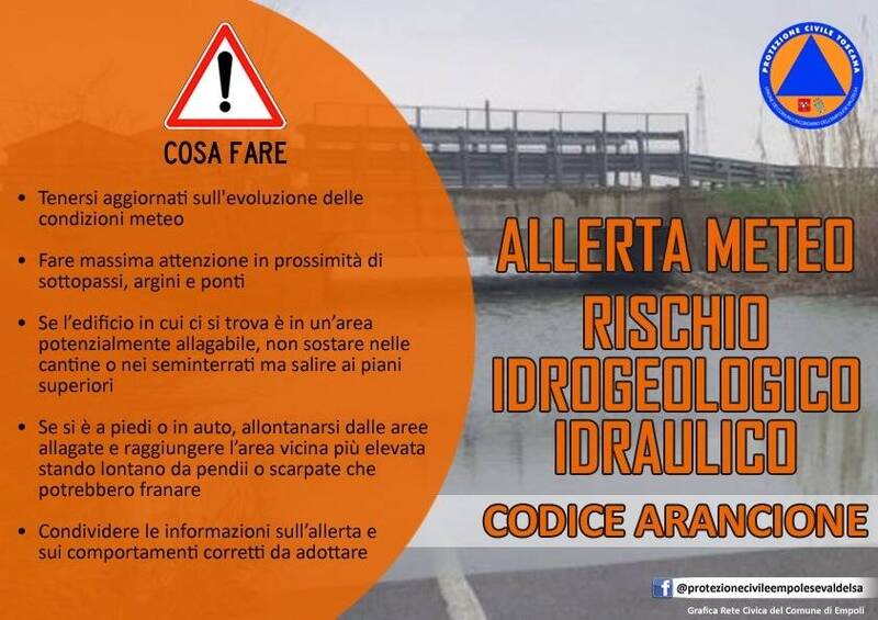 Allerta codice ARANCIONE per i rischi IDROGEOLOGICO-IDRAULICO RETICOLO MINORE E TEMPORALI FORTI in tutti i Comuni dell'Empolese Valdelsa, per la giornata di domani mercoledì 22 ottobre 2025.