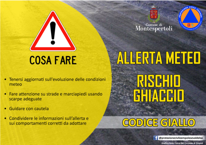 Allerta Codice GIALLO per rischio GHIACCIO, per i Comuni di Castelfiorentino, Certaldo, Gambassi Terme, Montaione e Montespertoli, per tutta la notte fino alla mattinata di domani Martedì 24 gennaio 2023.