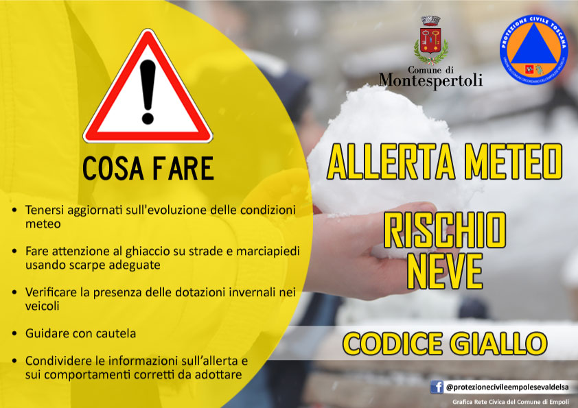 Allerta GIALLO per il RISCHIO NEVE prevista, in tutto il territorio dell'Unione dei Comuni Circondario dell'Empolese Valdelsa, dalla tarda serata di oggi Mercoledi 18 Gennaio 2023 fino alla tarda sera di domani Giovedi 19 Gennaio 2023.
