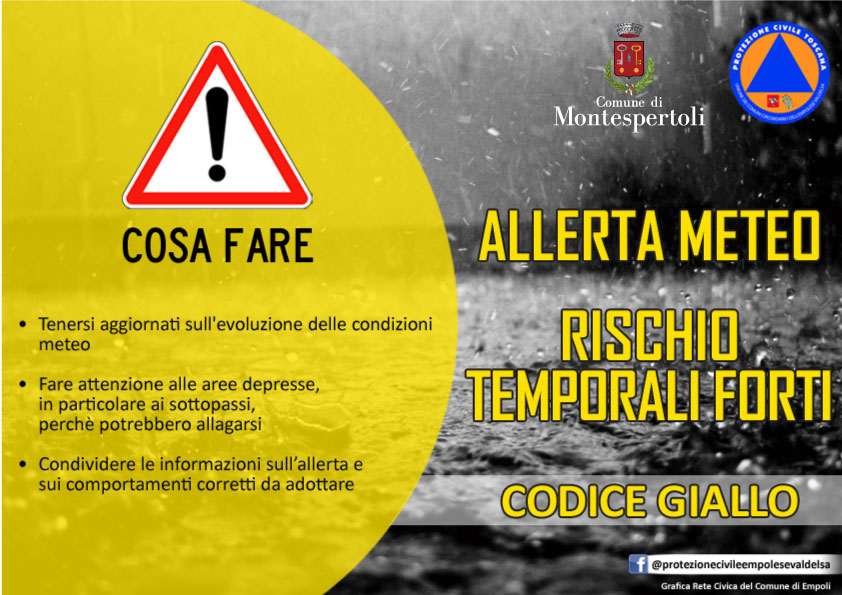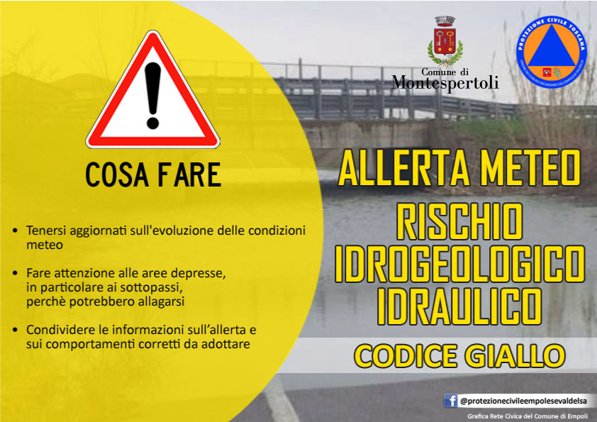 Allerta Codice GIALLO per i Comuni di Castelfiorentino, Certaldo, Gambassi Terme, Montaione e Montespertoli per i seguenti rischi: