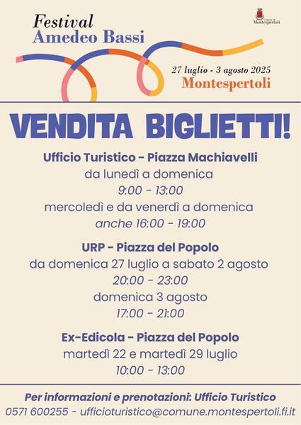 online su www.ciaotickets.com; di persona, da martedì a domenica, presso l’Ufficio Turistico di Montespertoli; nei locali dell’URP di Piazza del Popolo, dalle ore 20:00 alle 23:00 da domenica 27 luglio a sabato 2 agosto e domenica 3 agosto dalle ore 17:00 alle ore 21:00; presso l’Ex Edicola di Piazza del Popolo, nei giorni martedì 22 e martedì 29 luglio. Inoltre, martedì mattina (22 e 29 luglio), l’Ufficio Turistico sarà presente al mercato settimanale, sempre presso l’ex edicola dalle ore 10:00 alle ore 13;00.
