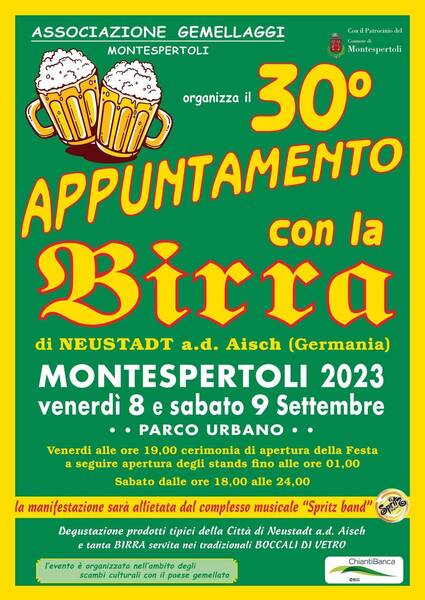 Un'occasione unica per scoprire il cibo e la birra tedesca, il 30° Appuntamento con la birra si terrà venerdì 8 e sabato 9 settembre al Parco Urbano di Montespertoli. L'evento è reso possibile grazie al gemellaggio con la città di Neustadt, che ha condiviso con Montespertoli la passione per la birra, la cultura e le tradizioni.