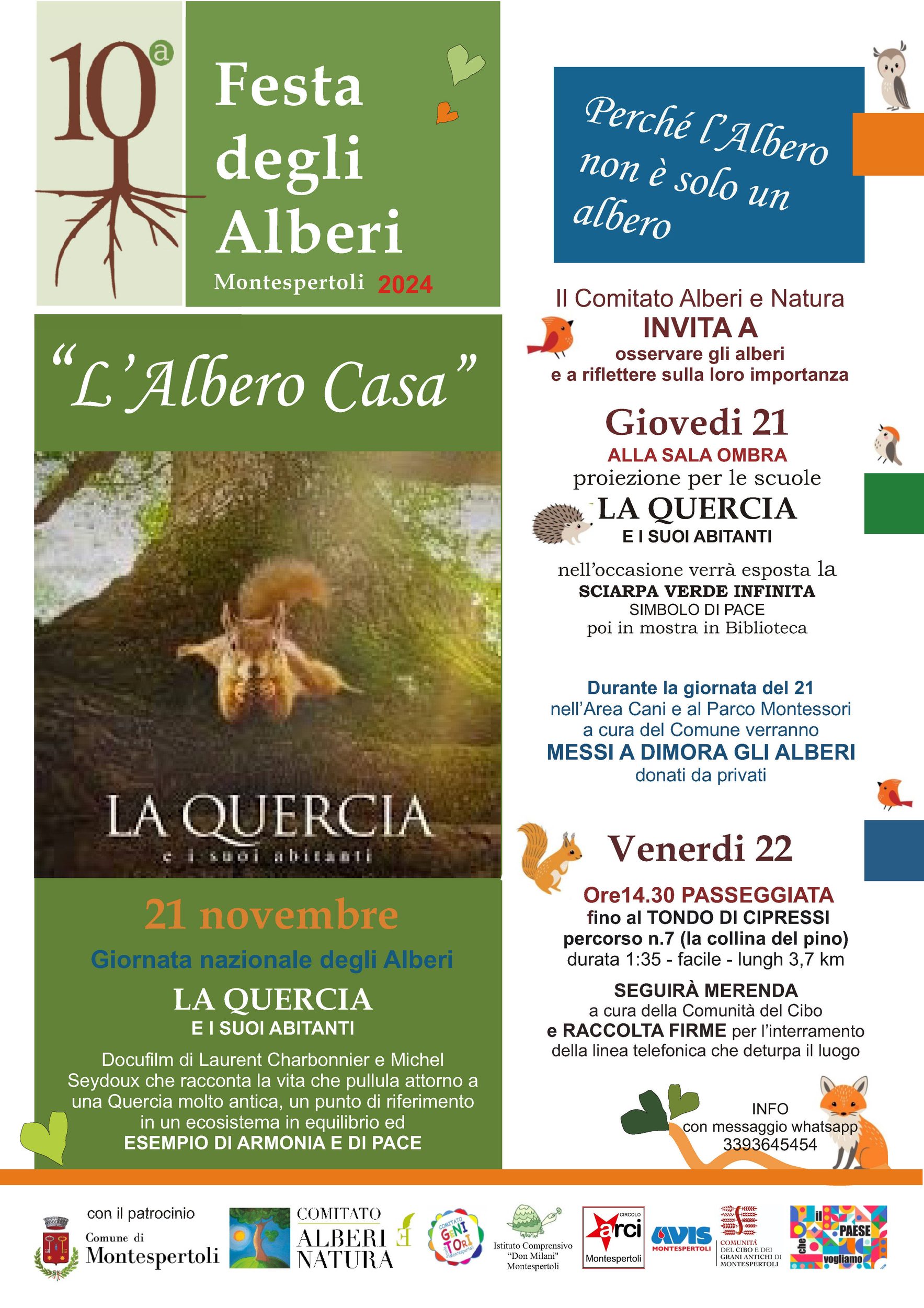 Il Comitato Alberi e natura organizza la 10ª edizione della Festa degli Alberi, un evento dedicato alla riflessione sull’importanza degli alberi, intitolato quest'anno "L'Albero Casa". La manifestazione si svolgerà in due giornate, il 21 e 22 novembre, in occasione della Giornata Nazionale degli Alberi, coinvolgendo scuole, famiglie e tutta la comunità locale.
