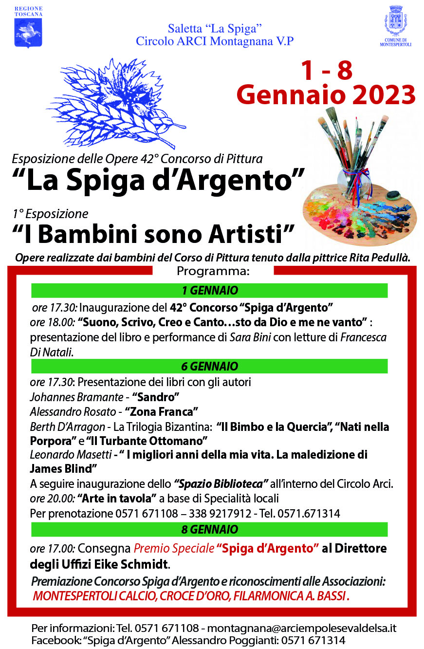 Dopo un anno di stop a causa dell’emergenza da Covid19 ecco la 42^ edizione del concorso di pittura la “Spiga d’argento”. L’inaugurazione della mostra delle opere in concorso è in programma per il 1° gennaio alle ore 17.30 presso la Saletta del Circolo Arci di Montagnana Val di Pesa.