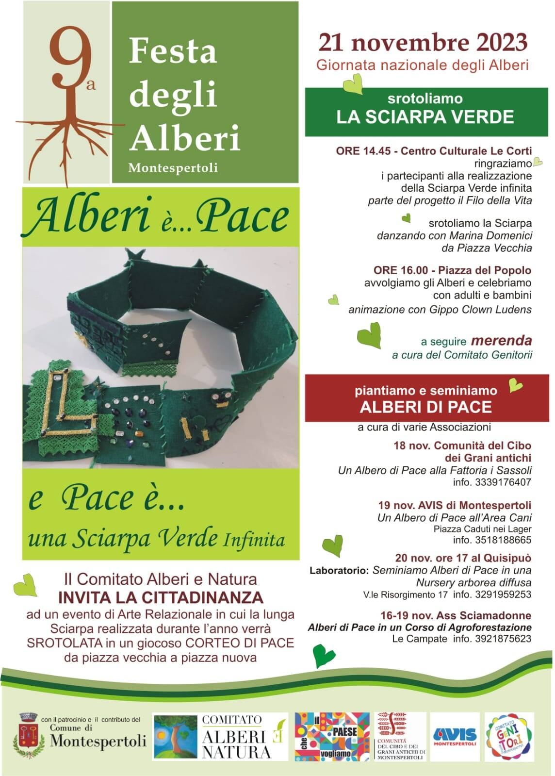 La sciarpa verde infinita, simbolo di pace e collaborazione, sarà dispiegata come un lungo filo verde che abbraccerà gli alberi di piazza del Popolo. La festa continuerà con celebrazioni, animazioni per grandi e piccini e una merenda a cura del Comitato Genitori Scuole di Montespertoli.