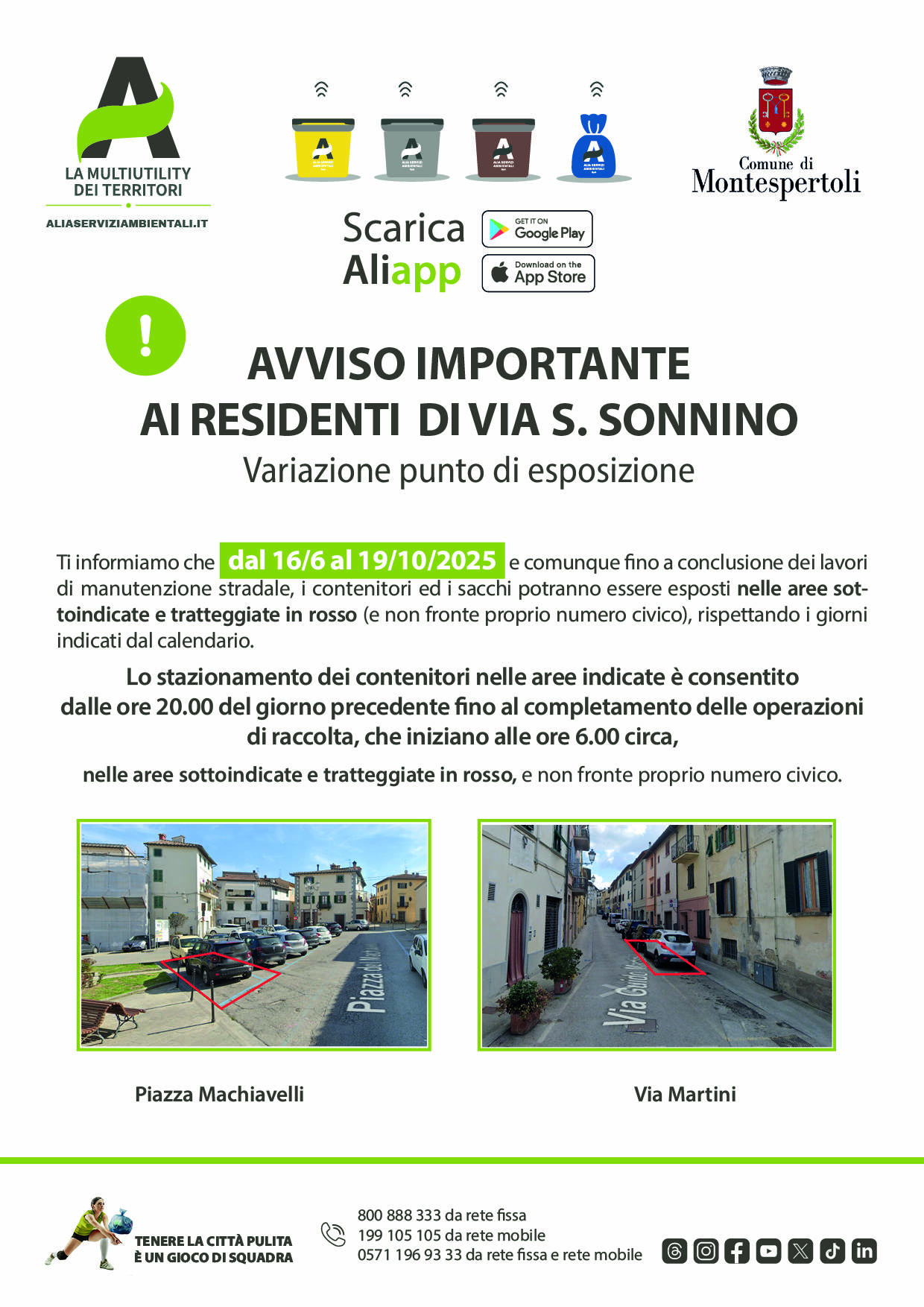 La prima fase di cantiere interessa esclusivamente via Sidney Sonnino e ha inizio il 16 giugno e si concluderà da cronoprogramma il 19 ottobre. In questo periodo il servizio di raccolta dei rifiuti su via Sonnino subirà un cambiamento: la raccolta non sarà più porta a porta davanti al numero civico di ciascuna abitazione, ma in due aree che saranno appositamente recintate a questo scopo in via Guido Martini angolo via Sidney Sonnino e in piazza Machiavelli. Le due aree saranno dotate di apposita cartellonistica e saranno monitorate dagli ispettori ambientali di ALIA, che informerà la cittadinanza di questo cambiamento tramite appositi volantini distribuiti casa per casa. I contenitori della raccolta, dunque, potranno essere lasciati a partire dalle 20:00 del giorno precedente in una delle due aree e ritirati una volta effettuata la raccolta. A questo scopo, ALIA ha comunicato al Comune di Montespertoli che il giro di raccolta sarà effettuato indicativamente alle ore 6:00 di ogni mattina. Per tutta l’estate, invece, via Roma non subirà cambiamenti e non sarà interessata dai lavori.
