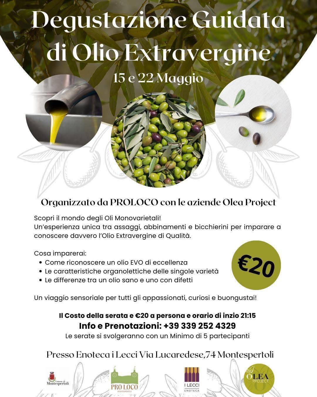Due appuntamenti per conoscere da vicino il mondo dell’olio extravergine di oliva di qualità. Il 15 e il 22 maggio, alle ore 21:15, l’Enoteca "I Lecci" di Montespertoli ospiterà due serate di degustazione guidata di olio extravergine, organizzate dalla Pro Loco Montespertoli in collaborazione con le aziende di Olea Project.