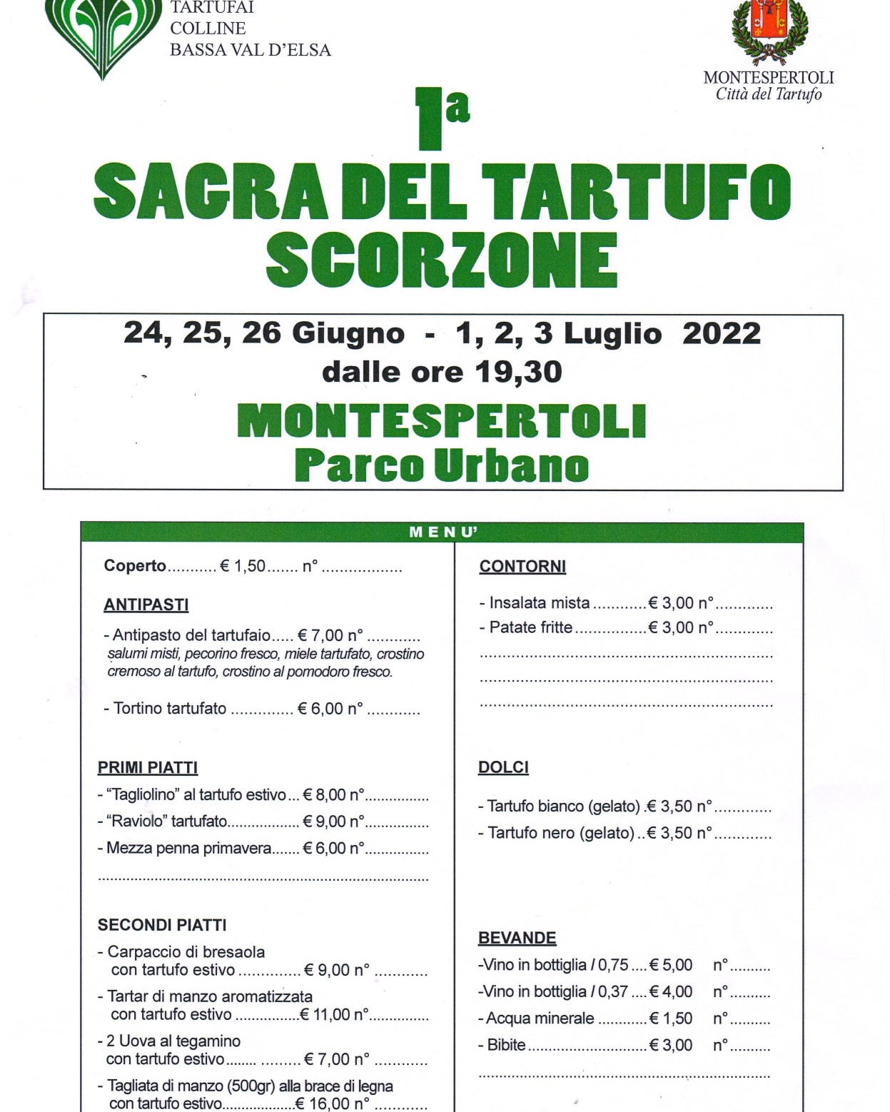 Dopo due anni di fermo a causa della pandemia torna la Sagra del Tartufo con un'edizione tutta nuova e estiva: per due weekend, da venerdì 24 a domenica 26 giugno e da venerdì 1° a domenica 3 luglio a Montespertoli si terrà la 1° edizione della Sagra del Tartufo Scorzone Toscano organizzata dall'Associazione Tartufai delle Colline della Bassa Valdelsa che quest’anno compie il suo trentesimo anno di vita.