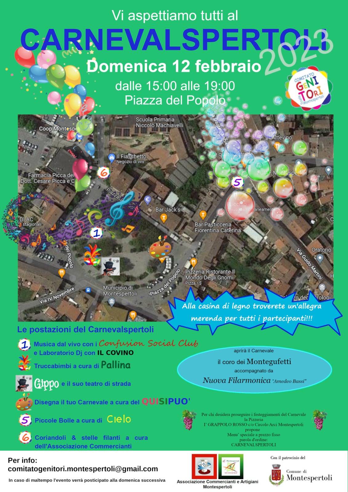Il Comitato Genitori Scuole Montespertoli, in collaborazione con l’Associazione Commercianti e Artigiani di Montespertoli, Patrocinati dal Comune di Montespertoli, annuncia la seconda edizione di “CarnevalSpertoli” . La festa di carnevale è programmata per domenica 12 febbraio, dalle ore 15:00 alle ore 19:00 in piazza del Popolo.