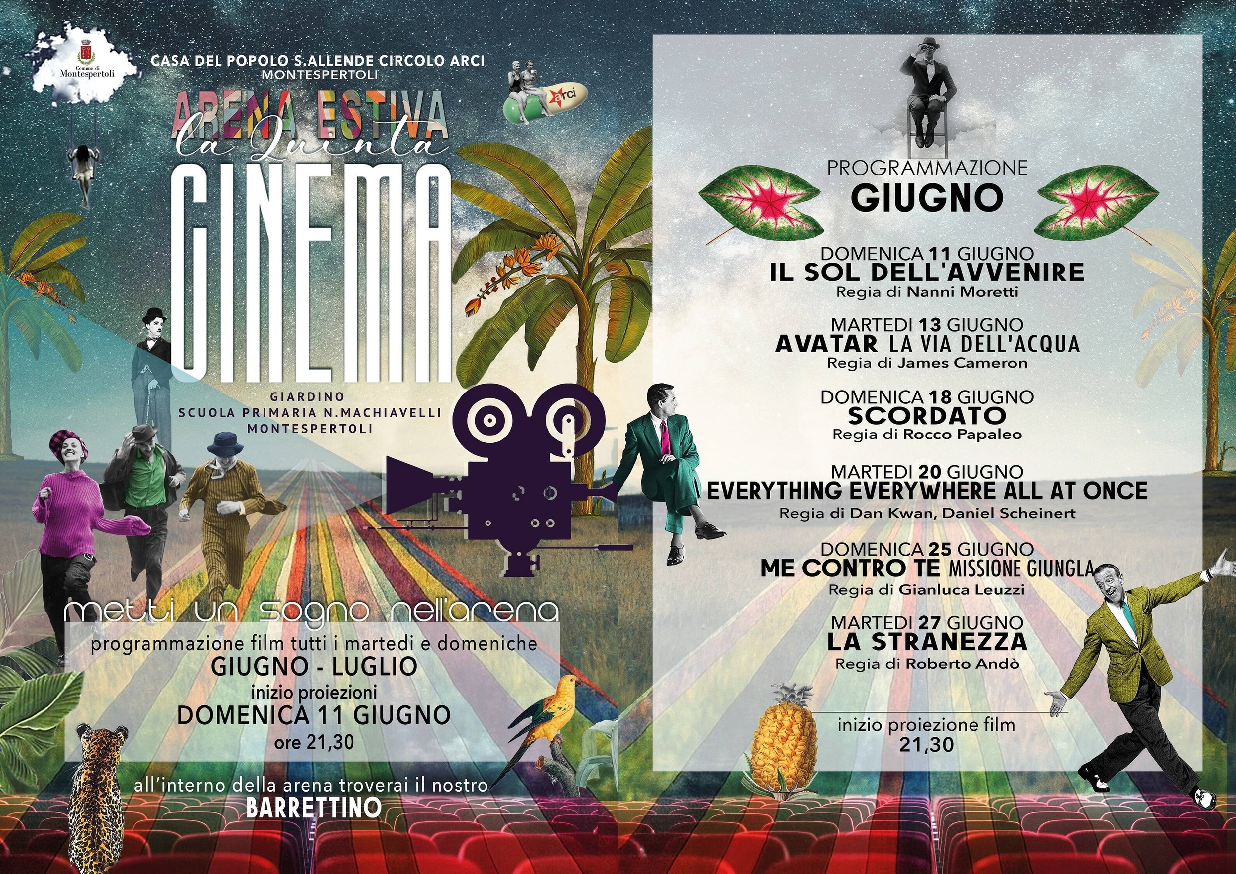 Domenica 11 giugno si apre l’Arena Estiva "La Quinta" nel giardino della scuola primaria “N. Machiavelli”. L’arena ospiterà tutta l’estate incontri, spettacoli e il cinema all’aperto. Ad annunciarlo la Casa del Popolo e il Circolo Arci S. Allende di Montespertoli che, patrocinati dal Comune di Montespertoli, organizzeranno il cinema all’aperto il martedì e la domenica di ogni settimana alle ore 21:30.