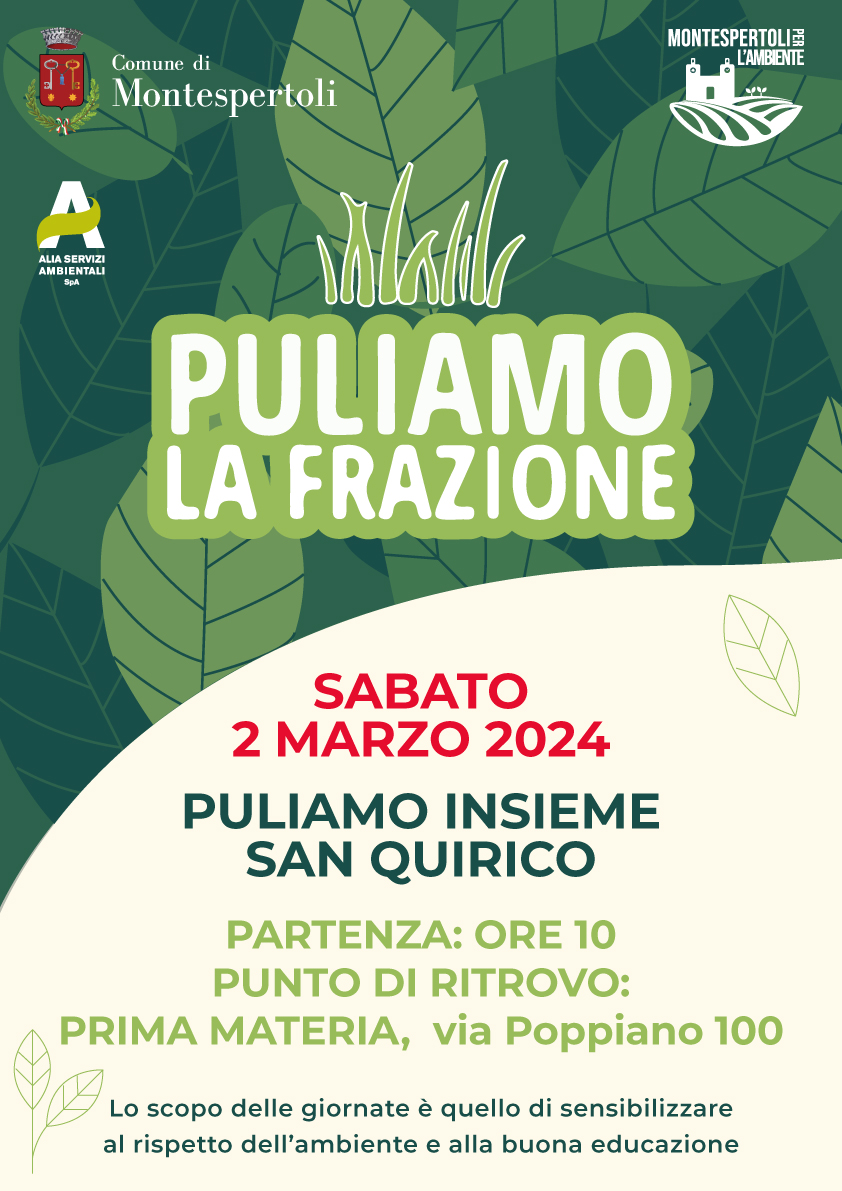 Torna l’appuntamento con “Puliamo la frazione” per sabato 2 marzo: l’iniziativa, organizzata dal Comune di Montespertoli, rientra nelle azioni di sensibilizzazione ambientale promosse dall’Amministrazione Comunale. L’appuntamento è per le ore 10 di sabato 2 marzo presso il centro di Prima Materia in via Poppiano, n. 100 a San Quirico in Collina: da lì i volontari partiranno in piccoli gruppi per ripulire le vie limitrofe. Il gestore del servizio integrato di raccolta dei rifiuti si occuperà poi di raccoglierli. L’Amministrazione Comunale invita tutta la cittadinanza – non soltanto quella residente nella frazione di San Quirico – a partecipare all’evento.