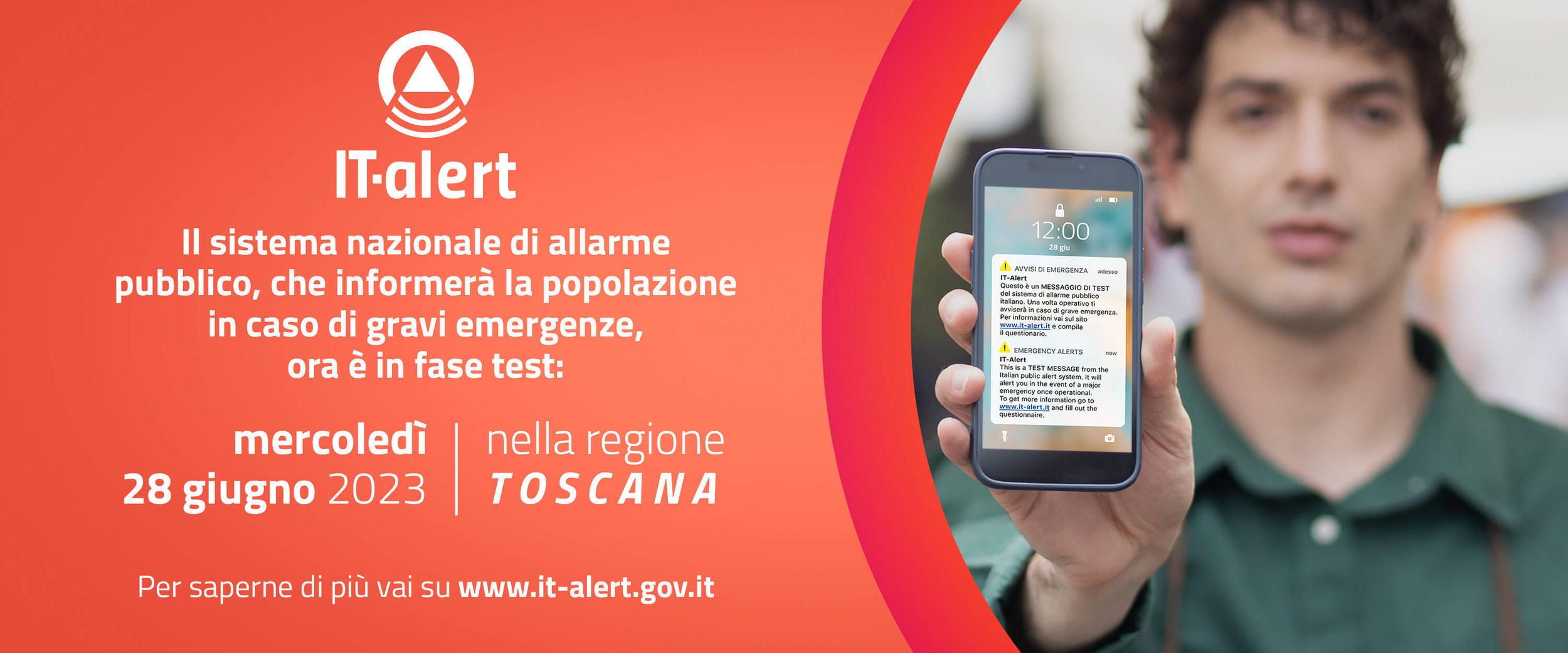 Mercoledì 28 giugno alle ore 12 tutti gli smartphone agganciati a cellule telefoniche toscane riceveranno in contemporanea un messaggio. Sarà un test, la prima prova di portata regionale in Italia del sistema IT-Alert, messo a punto dal Dipartimento nazionale di Protezione civile, in collaborazione con la Protezione civile regionale, per sfruttare in senso positivo le grandi potenzialità delle nuove tecnologie ed avvisare i cittadini in tempo reale in caso di gravi emergenze, eventi catastrofici imminenti o in corso.