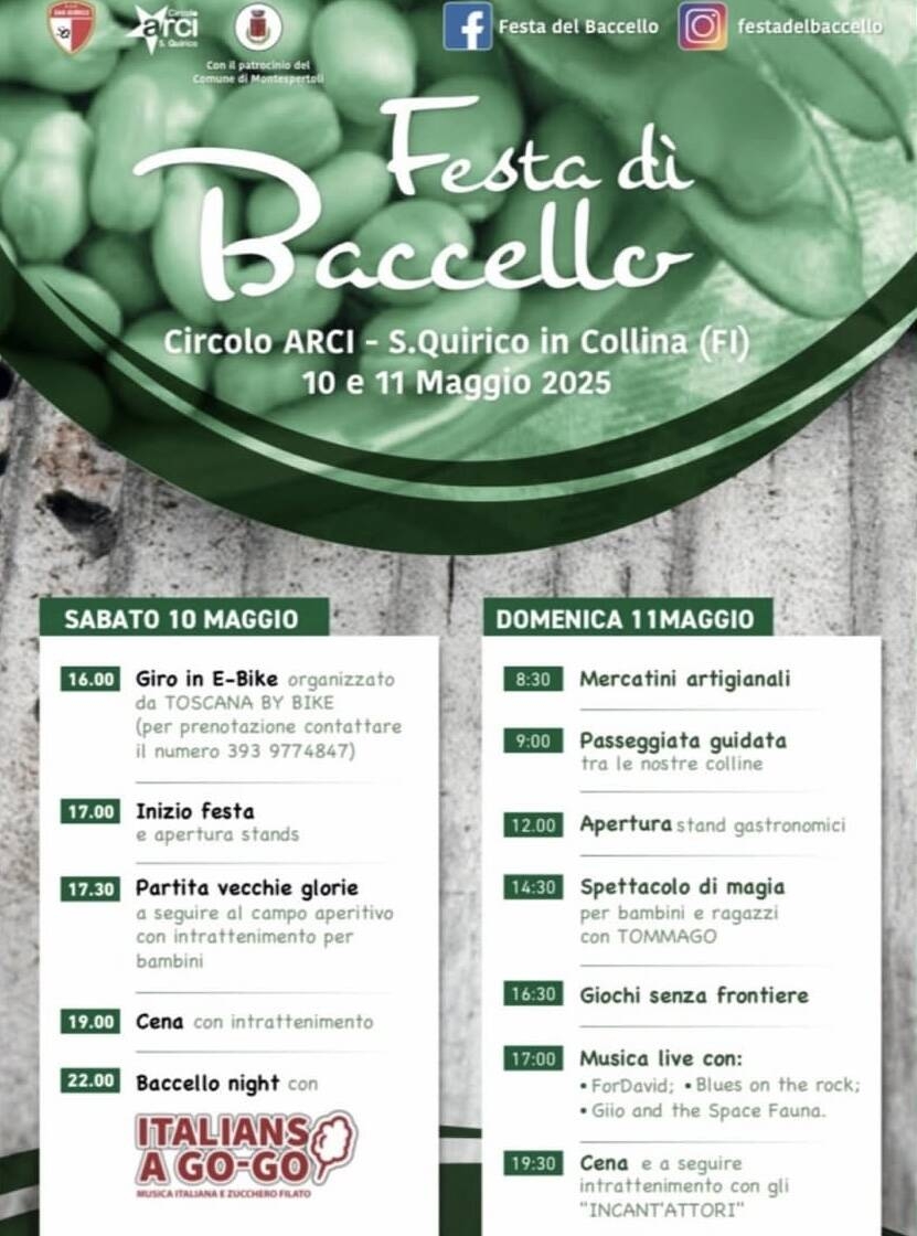 Sabato 10 e domenica 11 maggio torna la Festa di' Baccello al Circolo ARCI di San Quirico in Collina, con il patrocinio del Comune di Montespertoli. Due giornate dedicate alla convivialità e alla tradizione. Il programma inizia sabato alle 16 con un giro in E-Bike a cura di Toscana by Bike (prenotazione al 393 9774847), seguito alle ore 17 dall’apertura della festa e degli stand. Alle 17.30 si gioca la partita delle vecchie glorie al campo sportivo, con aperitivo e intrattenimento per bambini. Dalle 19 cena e alle 22 musica con la serata “Baccello Night” insieme agli Italians a Go-Go e DJ ROIDA WITTE.