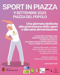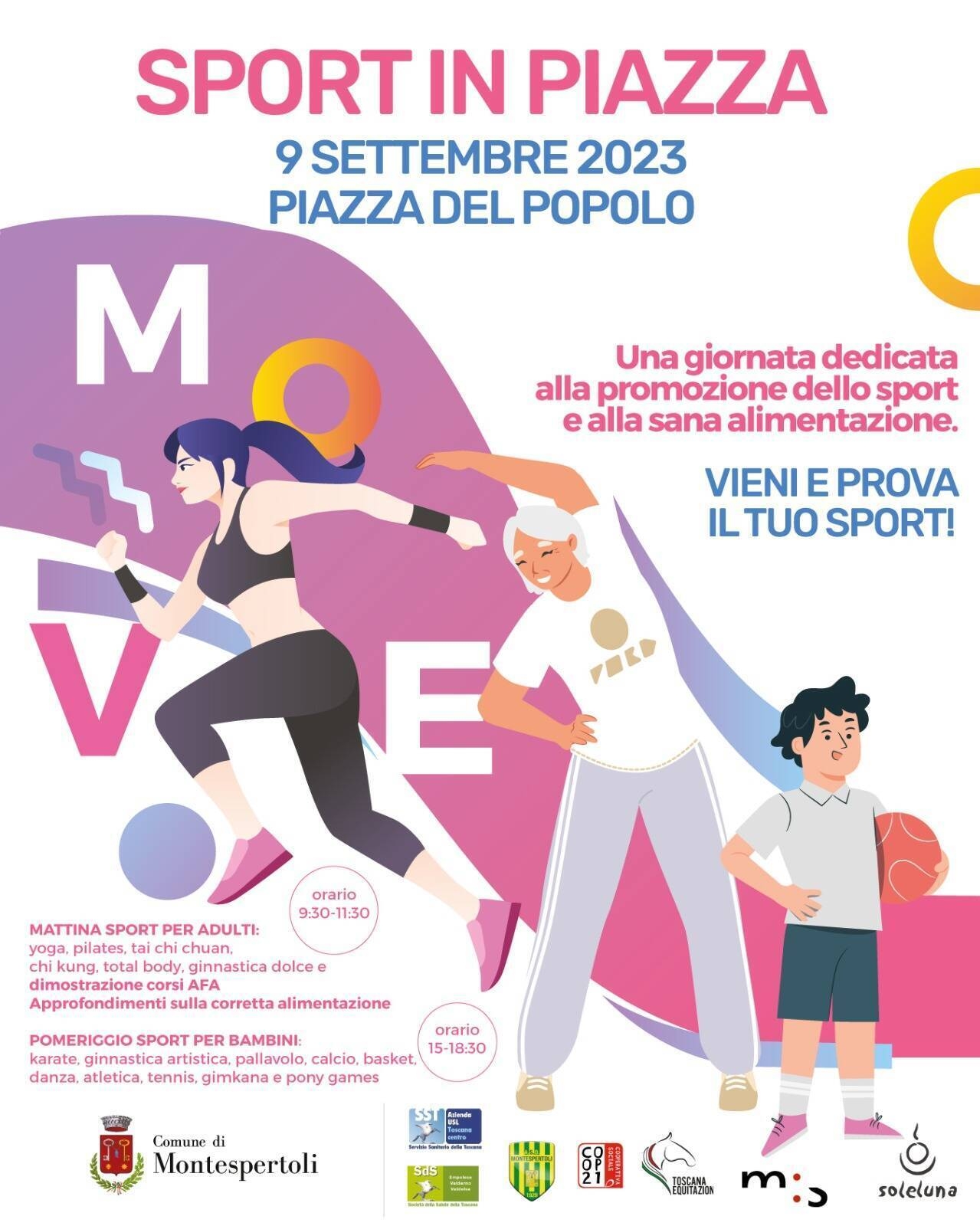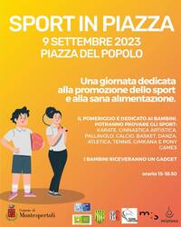 Sabato 9 Settembre 2023 Piazza del Popolo si animerà con lo sport. Come ogni anno l'Amministrazione Comunale propone una giornata per far conoscere le attività sportive che le associazioni del territorio offrono sia ai bambini che agli adulti. Questa iniziativa si ripromette di offrire una giornata di attività sportiva e formazione sull'alimentazione per tutte le età.
