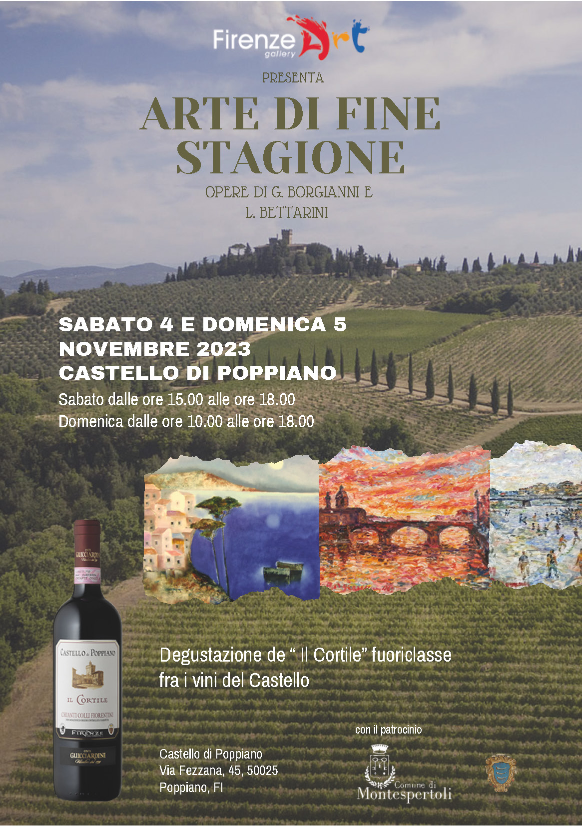 Firenze Art Gallery, con il patrocinio del Comune di Montespertoli, organizza una straordinaria esposizione d'arte presso il suggestivo Castello di Poppiano, un'occasione unica per immergersi nell'arte dei maestri fiorentini Lido Bettarini e Guido Borgianni. L'evento, intitolato "Arte di Fine Stagione" si svolgerà durante il weekend di sabato 4 e domenica 5 novembre con i seguenti orari: Sabato dalle ore 15 alle ore 18 e domenica dalle ore 10 alle ore 18, offrendo ai visitatori l'opportunità di scoprire opere d'arte eccezionali in uno scenario affascinante.