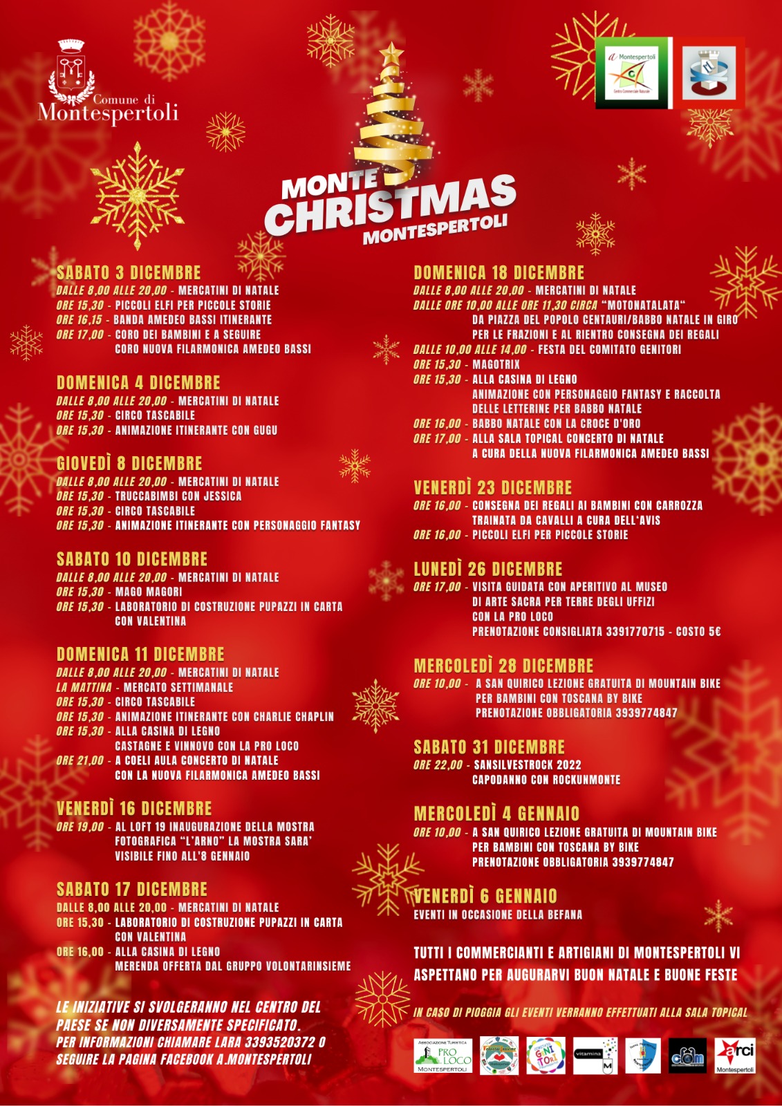 "Monte Christmas" è il nome dell'iniziativa organizzata dall'Associazione Commercianti che prevede un ricco programma di eventi per le festività natalizie a partire da sabato 3 dicembre. Oltre alle loro iniziative a Montespertoli non mancheranno i concerti musicali a incorniciare le prossime settimane.