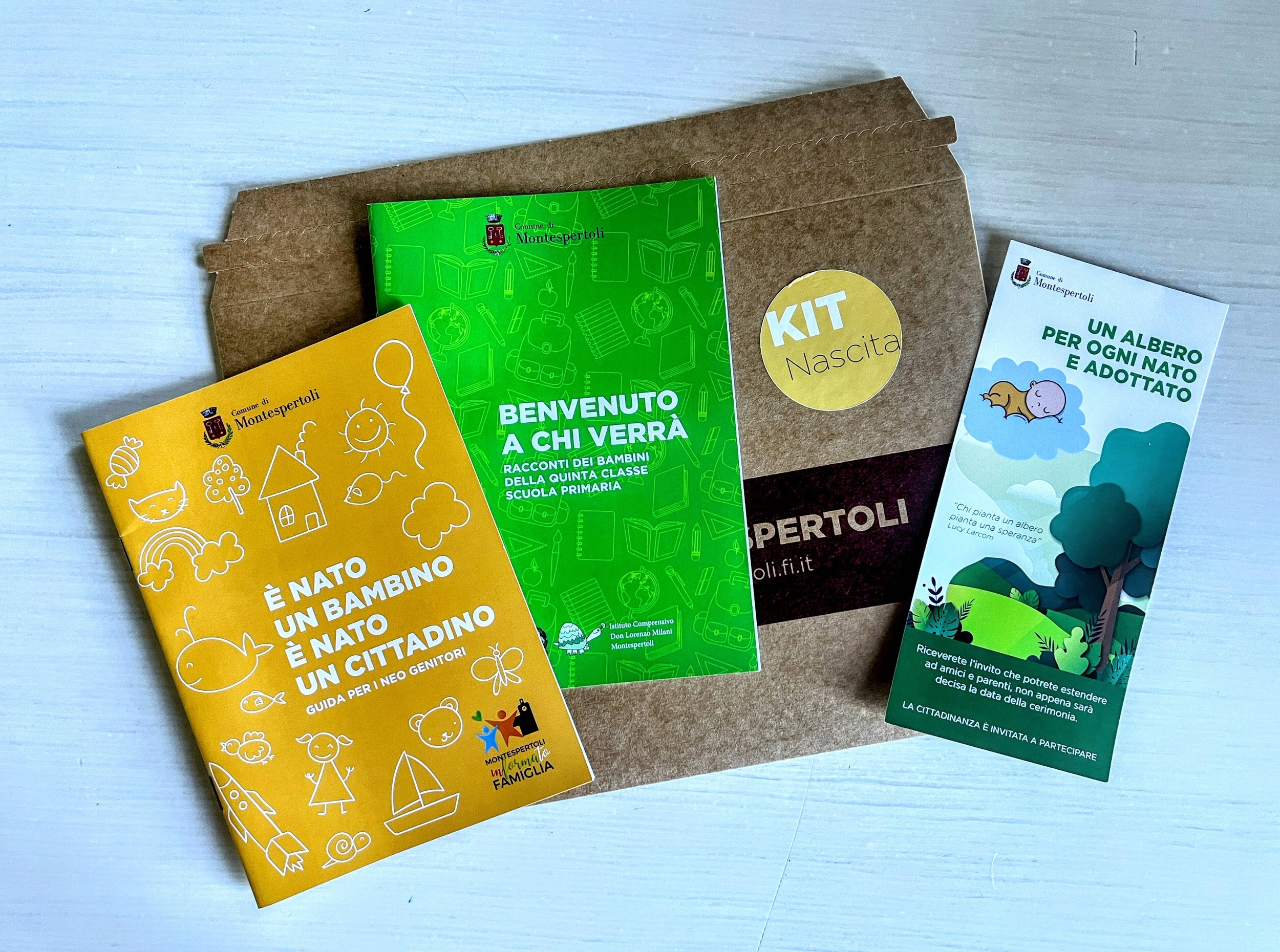 Il kit include una guida per neogenitori intitolata “È nato un bambino, è nato un cittadino”. Questo manuale fornisce istruzioni sulle pratiche burocratiche per il neonato, indica gli uffici scolastici e sanitari nella città e presenta i sostegni economici disponibili per madri sole, per famiglie numerose o con minori disabili. È una risorsa completa per orientarsi nei primi mesi di vita del bambino e conoscere i servizi offerti nel territorio. Un opuscolo con racconti dei bambini della quinta classe della Scuola Primaria “Benvenuto a chi verrà”, realizzato in collaborazione tra l'Amministrazione Comunale e l'Istituto Comprensivo di Montespertoli. Infine un'informativa sull'adozione dell’iniziativa “Un albero per ogni nato e adottato”. Il Comune di Montespertoli ha aderito alla pratica della legge n.10 del 2013, che prevede la messa a dimora di un albero per ogni nuovo nato o adottato nei comuni con più di 15000 abitanti. Nonostante Montespertoli non raggiunga questo numero, è stato scelto di partecipare per contribuire con le famiglie a preservare l'ambiente. Ogni anno sarà organizzato l’evento.