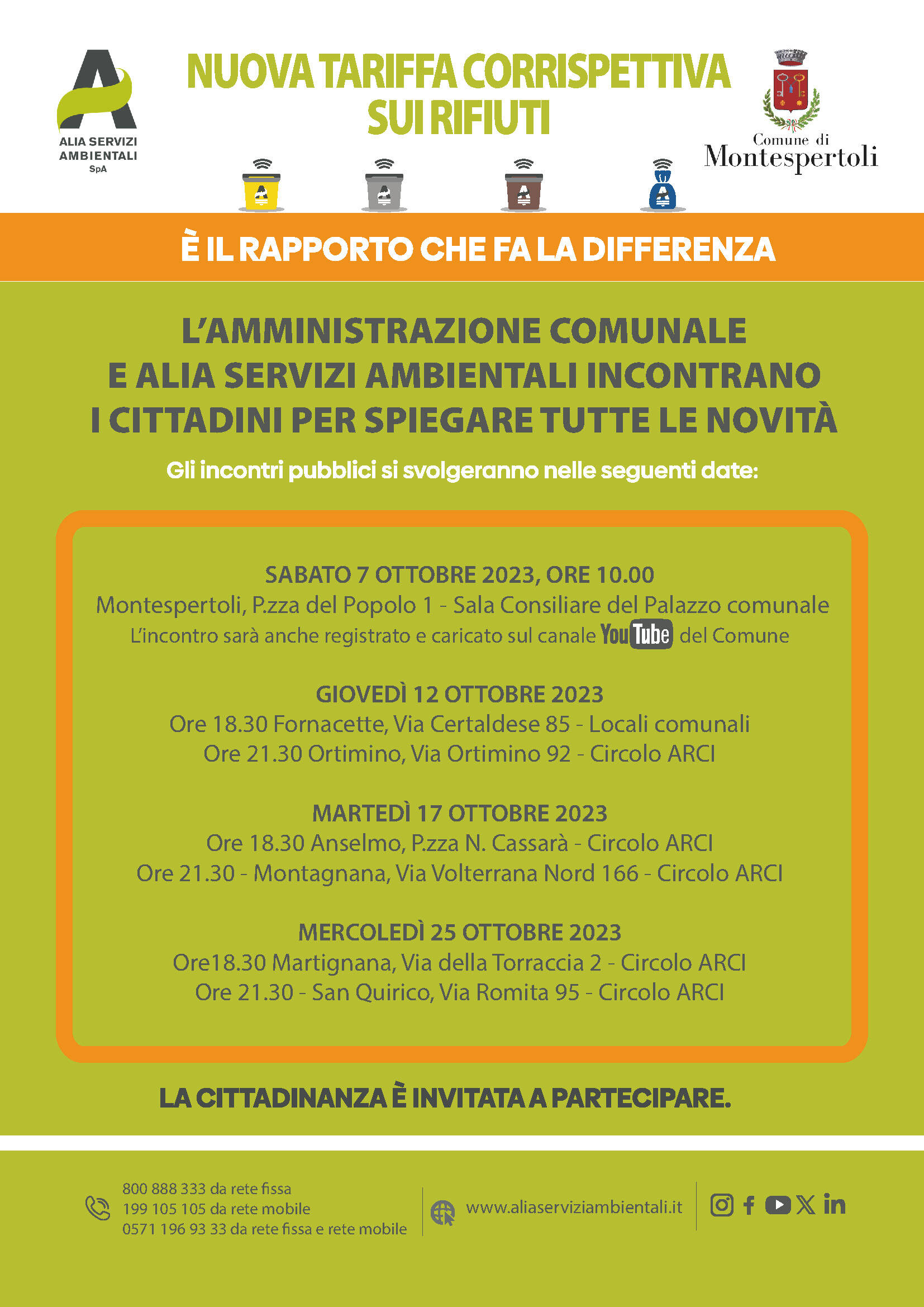 Considerata l’assoluta novità del sistema legato alla tariffa corrispettiva Alia Servizi Ambientali SpA, in accordo con l’amministrazione comunale di Montespertoli, sta predisponendo una specifica e mirata attività di comunicazione che prevede anche il coinvolgimento diretto della cittadinanza a partire già dal mese di ottobre. L’obiettivo è quello di essere di aiuto agli utenti nel cambio di abitudini e nell’approccio al nuovo sistema, che sarà comunicato alla cittadinanza anche con l’invio di una lettera al proprio domicilio.