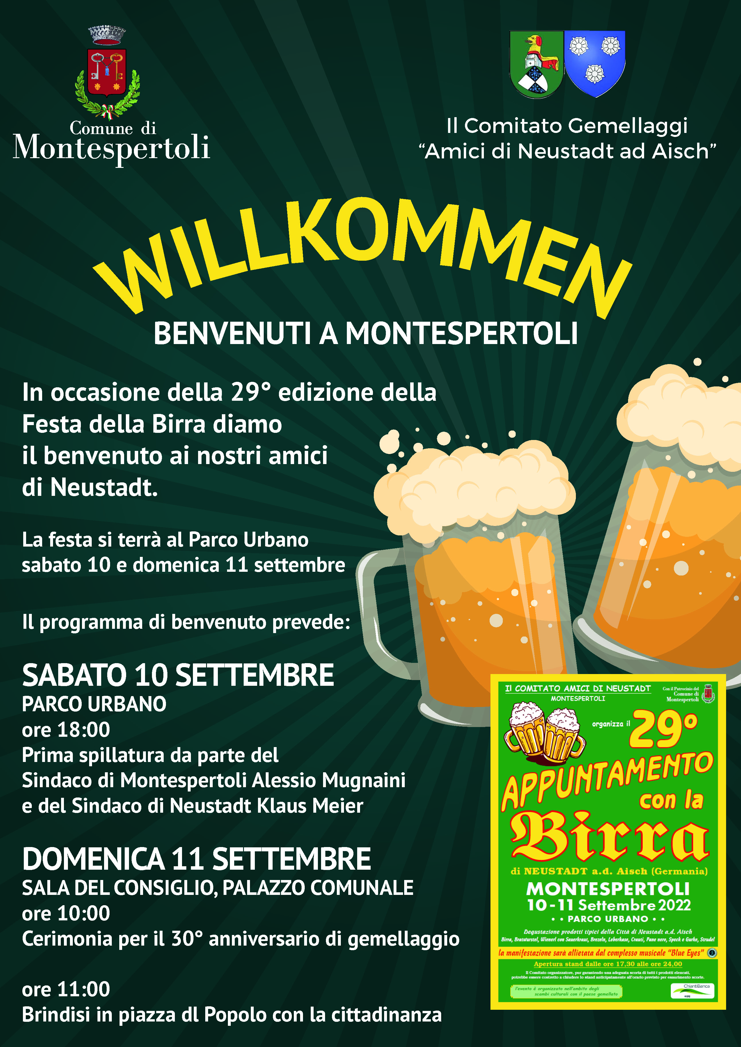 Sabato 10 e domenica 11 settembre Montespertoli ospiterà la delegazione della città di Neustadt an der Aisch in occasione del tradizionale “Appuntamento con la Birra” che si terrà al Parco Urbano.