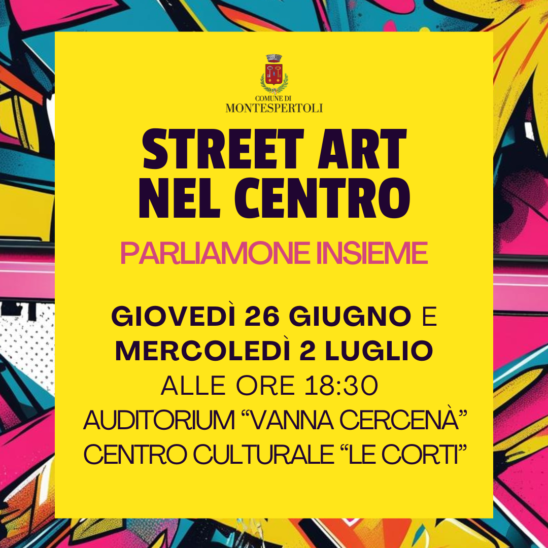 Due appuntamenti di approfondimento sul progetto di street art pensato dall’amministrazione per il centro storico di Montespertoli: li organizza il Comune di Montespertoli per giovedì 26 giugno e mercoledì 2 luglio alle ore 18:30 presso l’auditorium “Vanna Cercenà” del Centro culturale “Le Corti” di via Sonnino.