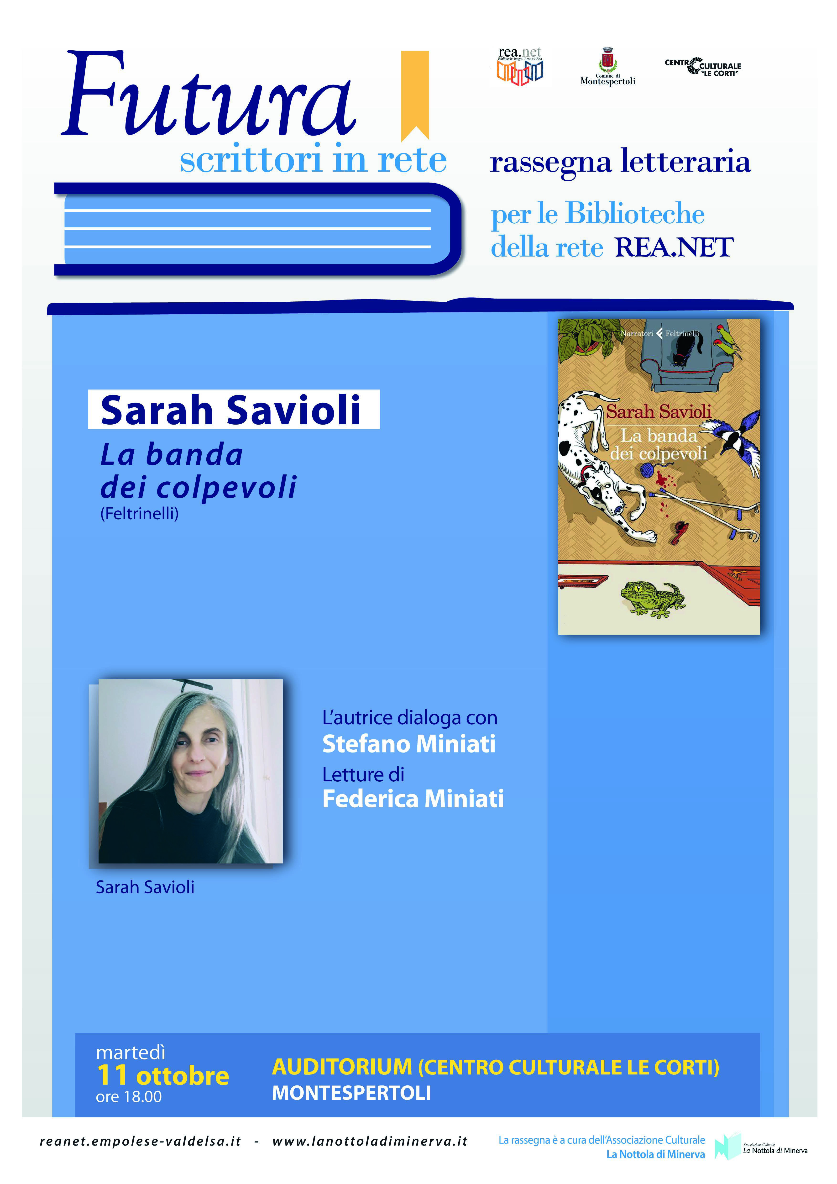 Martedì 11 ottobre alle ore 18 presso il Centro Culturale "Le Corti" a Montespertoli, via Sonnnino 1, nell'ambito della rassegna Futura - Scrittori in rete, l’Associazione Culturale La Nottola di Minerva, con il contributo della rete Rea.Net, presenta: Sarah Savioli con il suo libro "La banda dei colpevoli", Feltrinelli. L'autrice dialoga con Stefano Miniati. Le letture di Federica Miniati.