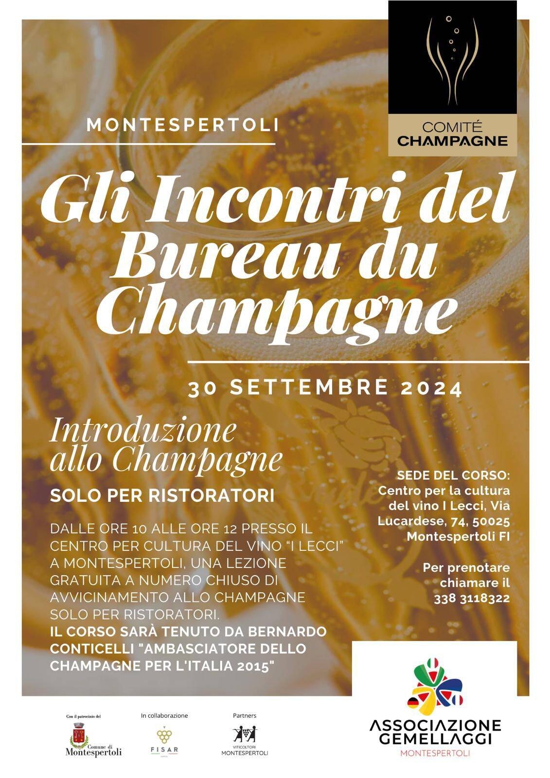 L'Associazione Gemellaggi di Montespertoli, in collaborazione con il Comité Champagne e con il patrocinio del Comune di Montespertoli, ha organizzato un evento esclusivo dedicato ai ristoratori: “Gli Incontri del Bureau du Champagne: introduzione allo Champagne”.