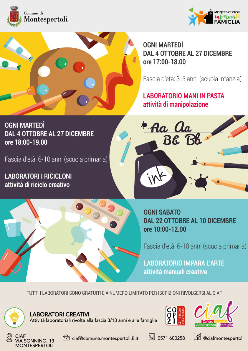 Il CIAF quest’anno organizzerà anche laboratori per i bambini/e suddivisi in due fasce d’età: scuola d’infanzia e scuola primaria. Inizieranno dal 4 ottobre e si svolgeranno ogni martedì pomeriggio. Inoltre ogni sabato mattina a partire dal 22 ottobre fino al 10 dicembre saranno organizzati altri laboratori manuali per la fascia 6-10 anni. Tutti i laboratori sono gratuiti ma a numero limitato, per informazioni su orari e tipologia di laboratorio si può contattare il centro al numero 0571600258 oppure mandare una email a ciaf@comune.montespertoli.fi.it.
