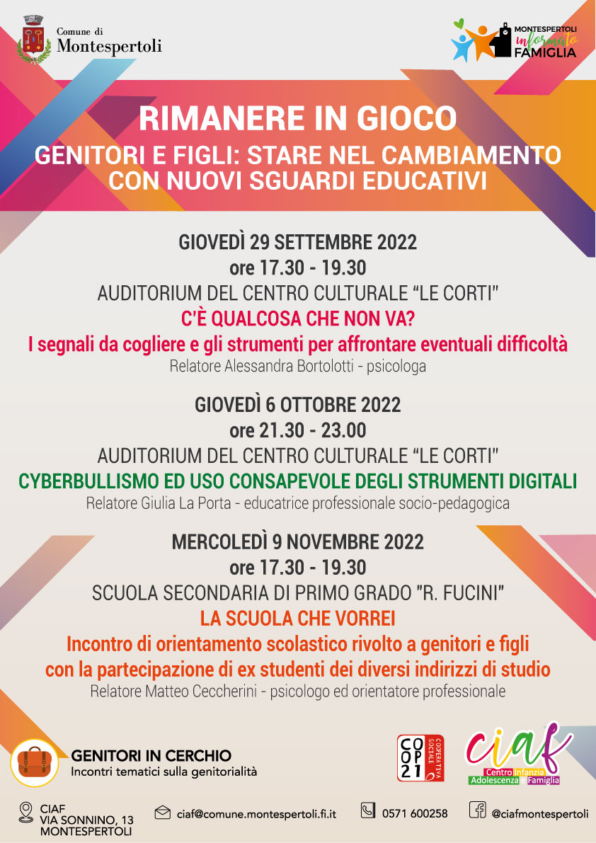 I prossimi incontri saranno: giovedì 6 ottobre al Centro Culturale “Le Corti” alle ore 21:30, sul tema “Cyberbullismo ed uso consapevole degli strumenti digitali” con il contributo di Giulia La Porta, educatrice professionale socio-pedagogica.