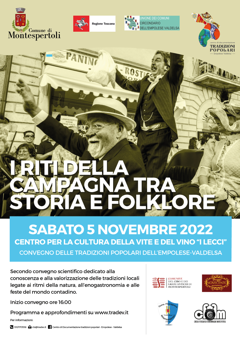 Si svolgerà il 5 novembre al Centro per la Cultura della Vite e del Vino “I Lecci” a Montespertoli il secondo convegno scientifico “I riti della campagna tra storia e folklore” organizzato dal Centro di Documentazione delle Tradizioni popolari, presieduto da Daniela Mancini, in collaborazione con l’Amministrazione Comunale e le associazioni del territorio (Nuova Filarmonica Amedeo Bassi, Gruppo ‘900, Circolo Fotografico FermoImmagine, Comunità del Cibo di Montespertoli).