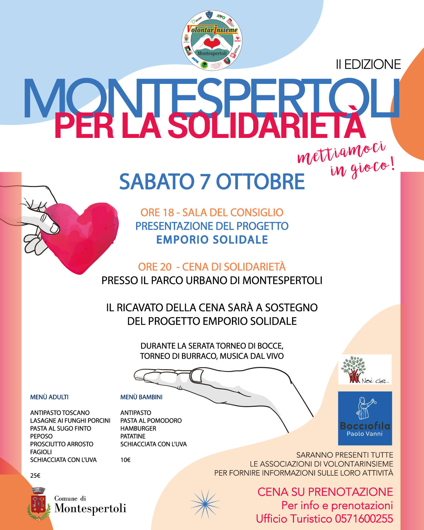 Montespertoli per la Solidarietà seconda edizione: un evento organizzato dal gruppo VolontariInsieme e dedicato alla solidarietà e al sostegno della comunità locale soprattutto alle famiglie che vivono in situazioni di difficoltà. In un mondo in cui la solidarietà è più importante che mai, Montespertoli si impegna a fare la differenza con un'iniziativa speciale:“Siamo fiduciosi che con il supporto di tutta la comunità di Montespertoli, possiamo fare una differenza concreta nella vita delle persone in difficoltà. Invitiamo tutti i cittadini, le aziende locali e le organizzazioni a unirsi a noi. L'evento del 7 ottobre sarà un'occasione straordinaria per unire le forze e sostenere il progetto dell'Emporio Solidale"dichiara l’Assessore al sociale, Daniela Di Lorenzo.