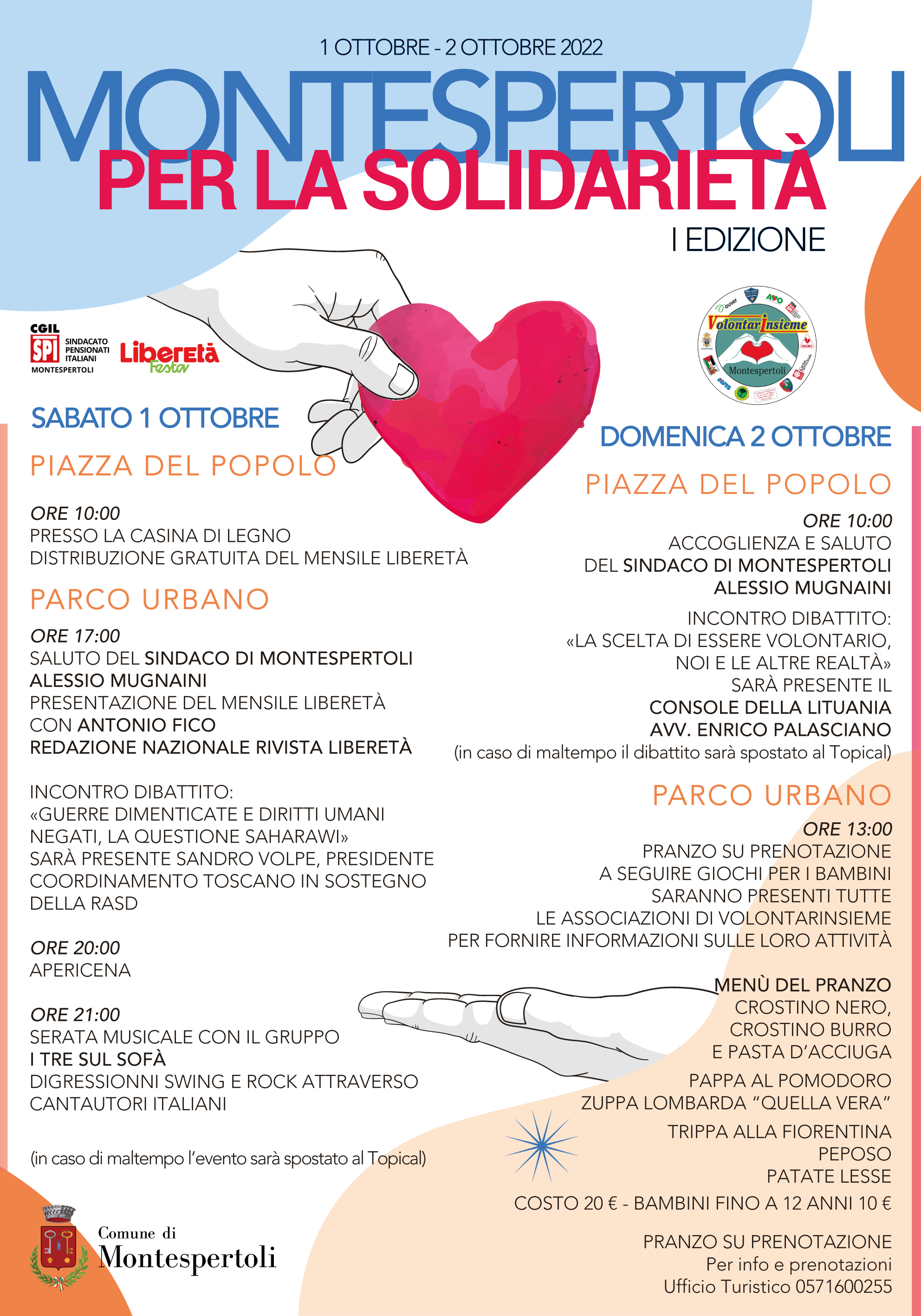 Il programma di sabato 1 ottobre prevede la presenza, alle ore 10:00 presso la casina di legno in Piazza del Popolo, dei rappresentanti della rivista “Liberetà” con la distribuzione delle copie della stessa, e nel pomeriggio, dalle ore 17:00, al Parco Urbano verrà approfondito l’argomento insieme al Sindaco di Montespertoli Alessio Mugnaini e ad Antonio Fico della redazione nazionale del mensile del sindacato dei pensionati della Cgil.