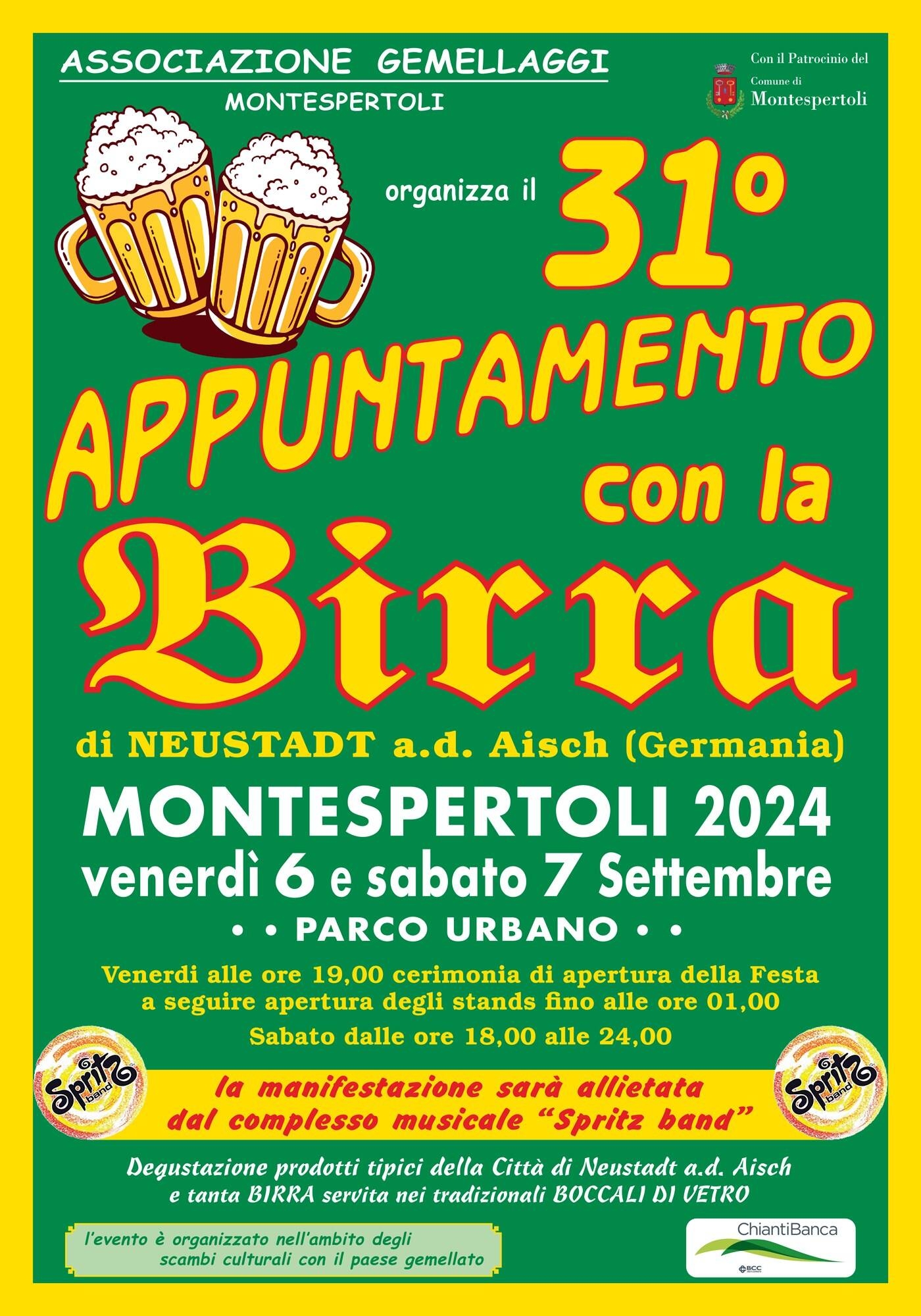 L'Associazione Gemellaggi Montespertoli, con il patrocinio del Comune di Montespertoli, organizza la 31ª edizione dell'Appuntamento con la Birra che si terrà venerdì 6 e sabato 7 settembre 2024 presso il Parco Urbano di Montespertoli. L'evento, nato nel contesto degli scambi culturali con la città gemellata di Neustadt a.d. Aisch (Germania), promette di essere un'esperienza imperdibile per tutti gli amanti della birra e della cultura bavarese.