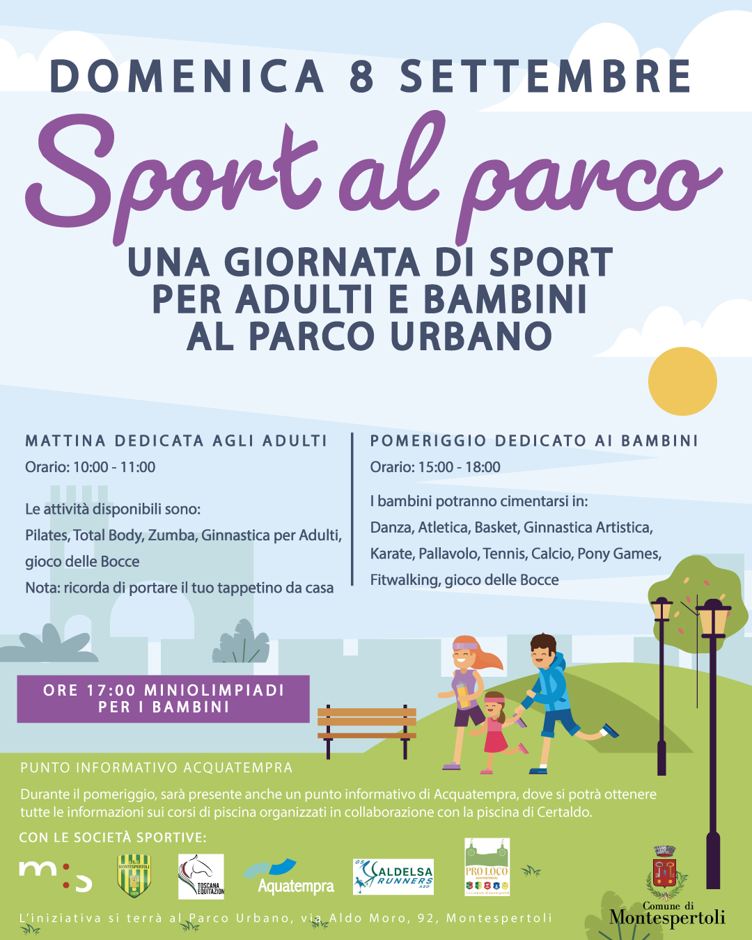 Anche per quest’anno l’Amministrazione Comunale ha organizzato il consueto appuntamento con lo sport con l’iniziativa "Sport al Parco": una giornata dedicata allo sport all'aria aperta pensata sia per gli adulti che per i bambini, che si terrà domenica 8 settembre presso il Parco urbano. L'iniziativa, volta a promuovere uno stile di vita sano e attivo, prevede attività sportive per tutte le età, in un contesto di divertimento e socialità.