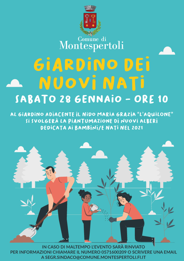 Il Comune di Montespertoli prosegue con il progetto il “Giardino della nuova vita” creato con l’intento di realizzare spazi verdi nel territorio per festeggiare i nuovi nati. Sabato 28 gennaio, alle ore 10, presso il giardino adiacente il Nido d’infanzia L’Aquilone si svolgerà la piantumazione di ben 81 nuove piante con una iniziativa aperta sia ai genitori sia ai bambini/e con l’intento di condividere insieme un momento di gioia. L’invito è rivolto a tutte le famiglie con un bambino o una bambina residenti nel comune nati o adottati nel 2021. Saranno messi a dimora alberi di quercia, lecci ed altri arbusti.