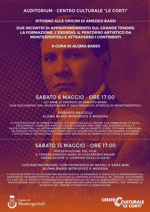 Il Comune di Montespertoli in collaborazione con la dott.ssa Aloma Bardi storica della musica e dirigente di ICAMus - The International Center for American Music, propongono per sabato 6 e sabato 13 maggio 2023, alle ore 17, due incontri di approfondimento sul tenore Amedeo Bassi presso l’Auditorium del Centro Culturale “Le Corti”.