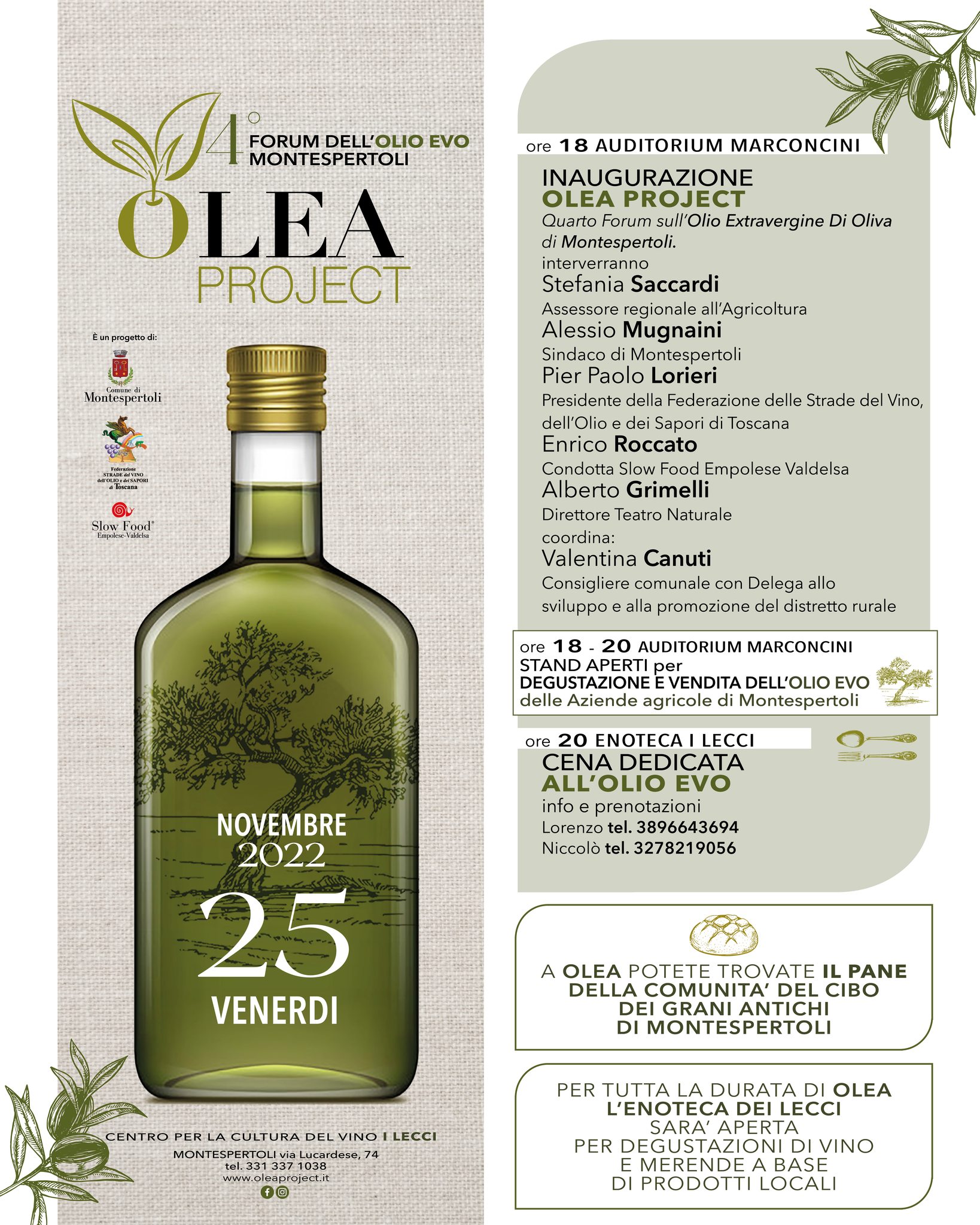“OLEA Project è un momento importantissimo per presentare l’olio extra vergine d’oliva di Montespertoli della nuova campagna ma anche per aggiornarsi e guardare allo sviluppo del comparto oleario. In questi anni le nostre aziende agricole hanno migliorato la qualità del proprio olio EVO e stanno incontrando sempre di più il gradimento dei consumatori. L’olio di Montespertoli non teme confronti e merita di essere assaggiato e utilizzato sulle nostre tavole. A OLEA sono certo che ve ne innamorerete.” commenta il Sindaco Alessio Mugnaini .