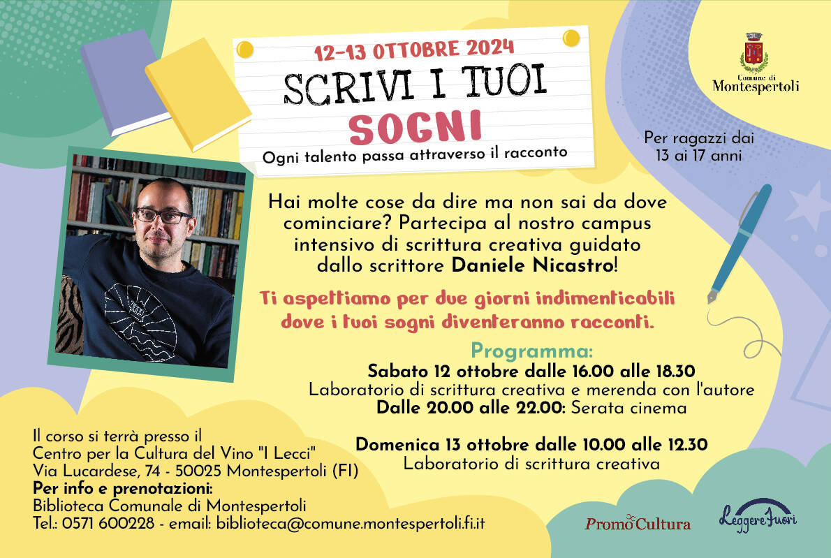 Il 12 e 13 ottobre 2024, i giovani aspiranti scrittori avranno l'opportunità di coltivare la propria immaginazione e abilità narrative al campus di scrittura creativa "Scrivi i tuoi sogni". Organizzato dalla Biblioteca comunale “Ernesto Balducci” e da PromoCultura Impresa Sociale, il campus (gratuito) si terrà al Centro per la cultura del vino "I Lecci" e sarà guidato dall’autore per ragazzi Daniele Nicastro. Due giornate ricche di laboratori e ispirazione, pensate per stimolare il talento dei partecipanti.