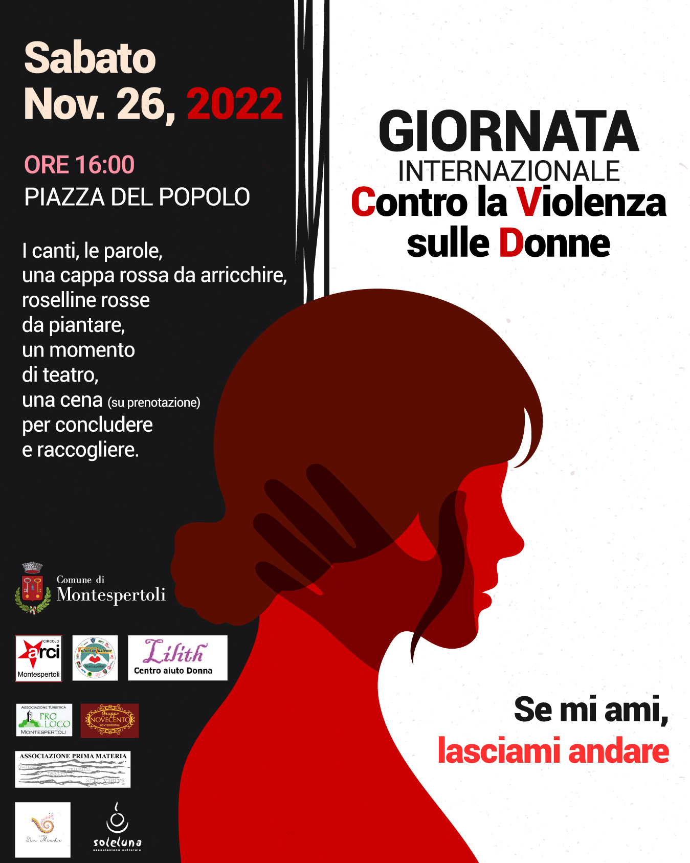 “Su questo tema che ci sta particolarmente a cuore abbiamo organizzato insieme al Circolo Arci S. Allende di Montespertoli ed a tante associazioni del territorio diversi momenti pubblici per alzare l’attenzione. Le riflessioni saranno diverse: utilizzeremo la forma del teatro e della musica e sarà presentato il progetto "La Cappa Rossa itinerante": un progetto che vede il coinvolgimento di tutta la cittadinanza. Invitiamo chi ci sarà ad indossare qualcosa di rosso, simbolo di questa battaglia, ed a portare anche solo un bottone da cucire sulla cappa." spiegano le Assessore Daniela Di Lorenzo e Alessandra De Toffoli “Con determinazione vogliamo rinnovare la nostra condanna contro ogni forma di violenza contro le donne. Non ci stancheremo mai di farlo, con altrettanto impegno continueremo a lavorare per informare, educare e sensibilizzare la cittadinanza sul tema.”