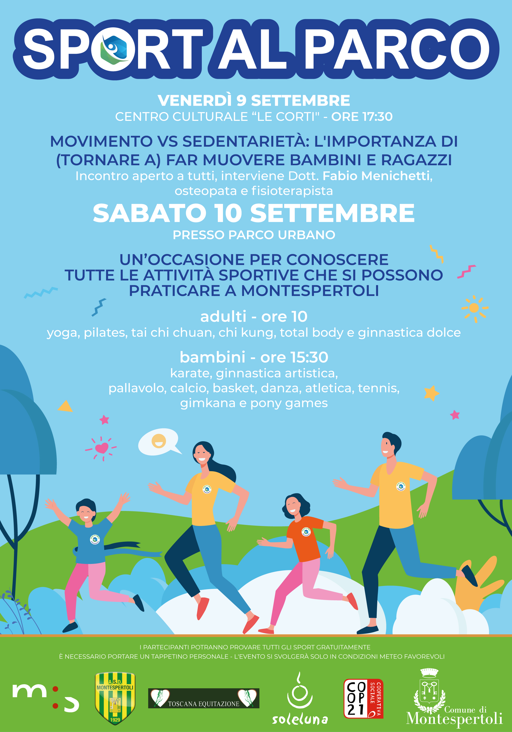 Ogni anno a Montespertoli, a settembre, si svolge l'evento "Sport al Parco" e quest'anno sarà arricchito da un incontro pomeridiano, venerdì 9 settembre, al Centro Culturale "Le Corti", intitolato "Movimento VS Sedentarietà: l'importanza di (tornare a) far muovere bambini e ragazzi" che vede il coinvolgimento del dott. Fabio Menichetti, osteopata e fisioterapista, che illustrerà in benefici della corretta pratica sportiva. L'incontro, fissato per le ore 17:30, è aperto a tutti ed in particolar modo a insegnanti, allenatori, preparatori sportivi delle società e genitori.