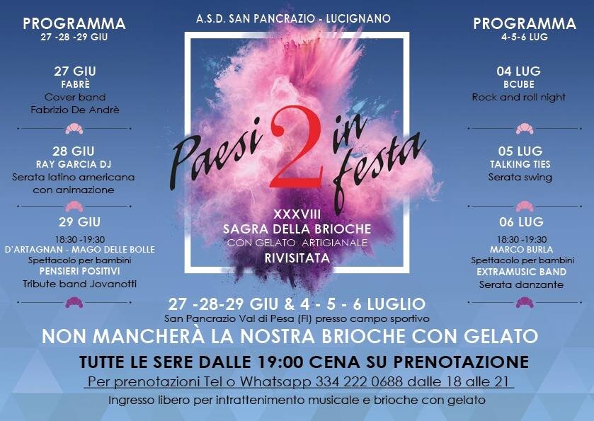La Sagra della Brioche con Gelato si inserisce all’interno della manifestazione “Due Paesi in Festa”, organizzata dall’Unione Sportiva Dilettantesca di San Pancrazio – Lucignano, che unisce le due frazioni vicine da cui prende il nome l’evento.