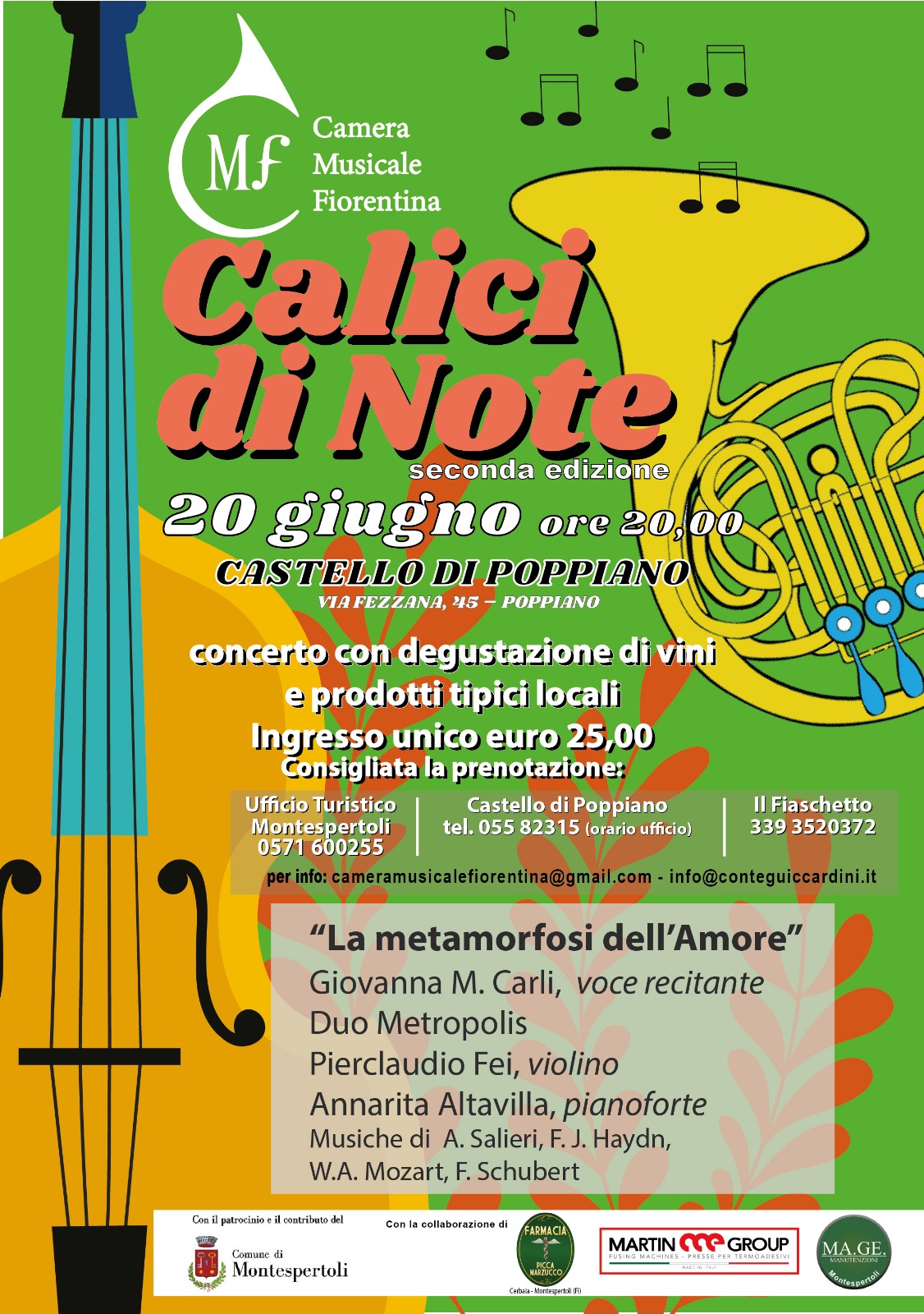 Musica, parole ed eccellenze del territorio. Torna a Montespertoli la rassegna “Calici di Note”, promossa dall’Associazione Camera Musicale Fiorentina, giunta alla sua seconda edizione e pensata per avvicinare anche i non appassionati alla musica classica, attraverso il dialogo tra arte, racconto e sapori locali.