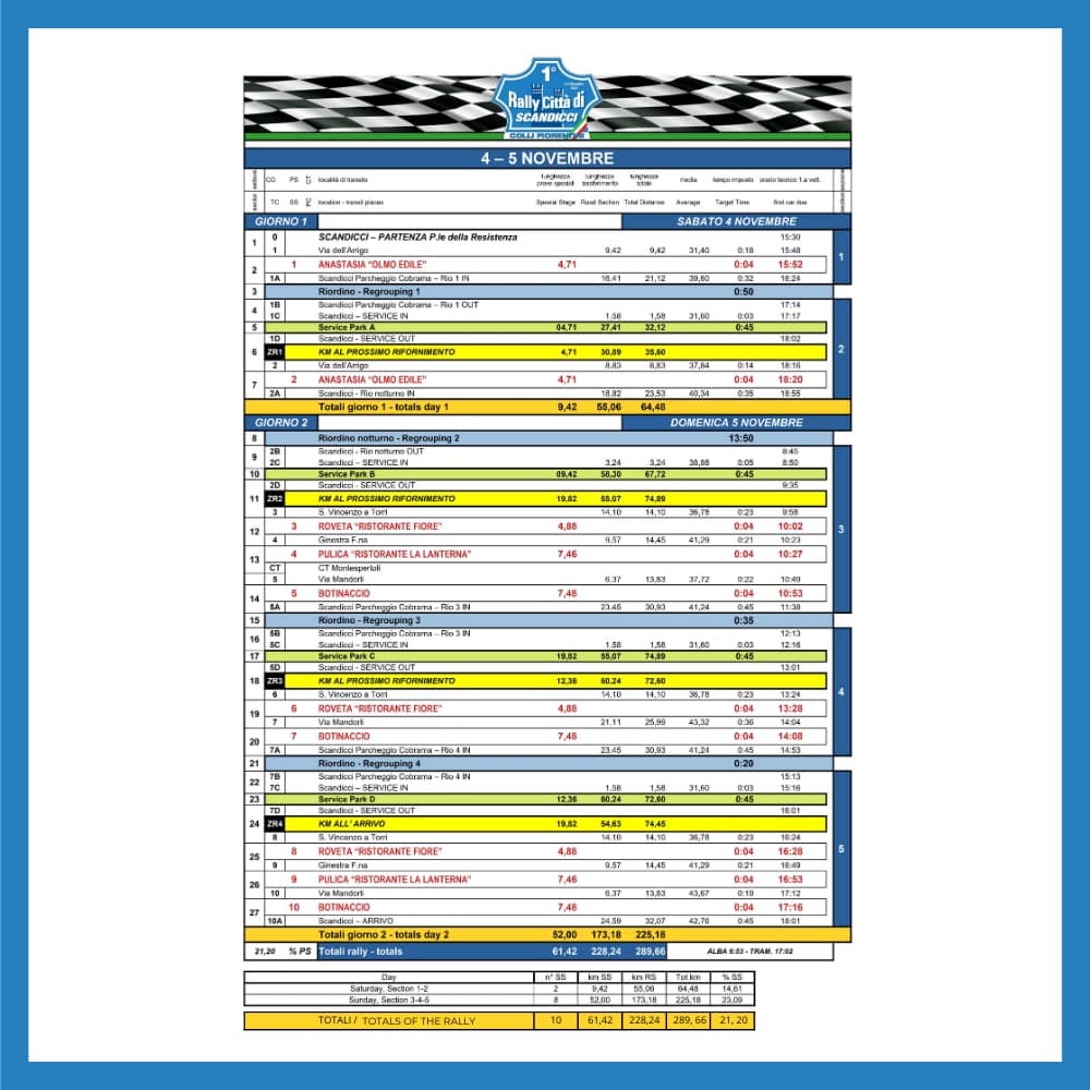 Scandicci sarà il centro propulsore della competizione, ospitando la partenza in Piazza della Resistenza alle 15,00 di sabato 4 novembre ed anche l’arrivo, previsto per la domenica dalle ore 17,00. Dopo la partenza i concorrenti affronteranno la prima prova speciale la “Anastasia” (Km. 4,710), per due volte, poi il rally si stopperà per riprendere l’indomani, domenica 5 novembre, con la restante parte di sfide. Sfide che saranno sulle “piesse” di Roveta”(Km. 4,880), “Pulica” (Km. 7,460”) e “Botinaccio “(Km. 7,480). L’arrivo sarà alle 18,01, sempre in Scandicci-Piazza della resistenza.