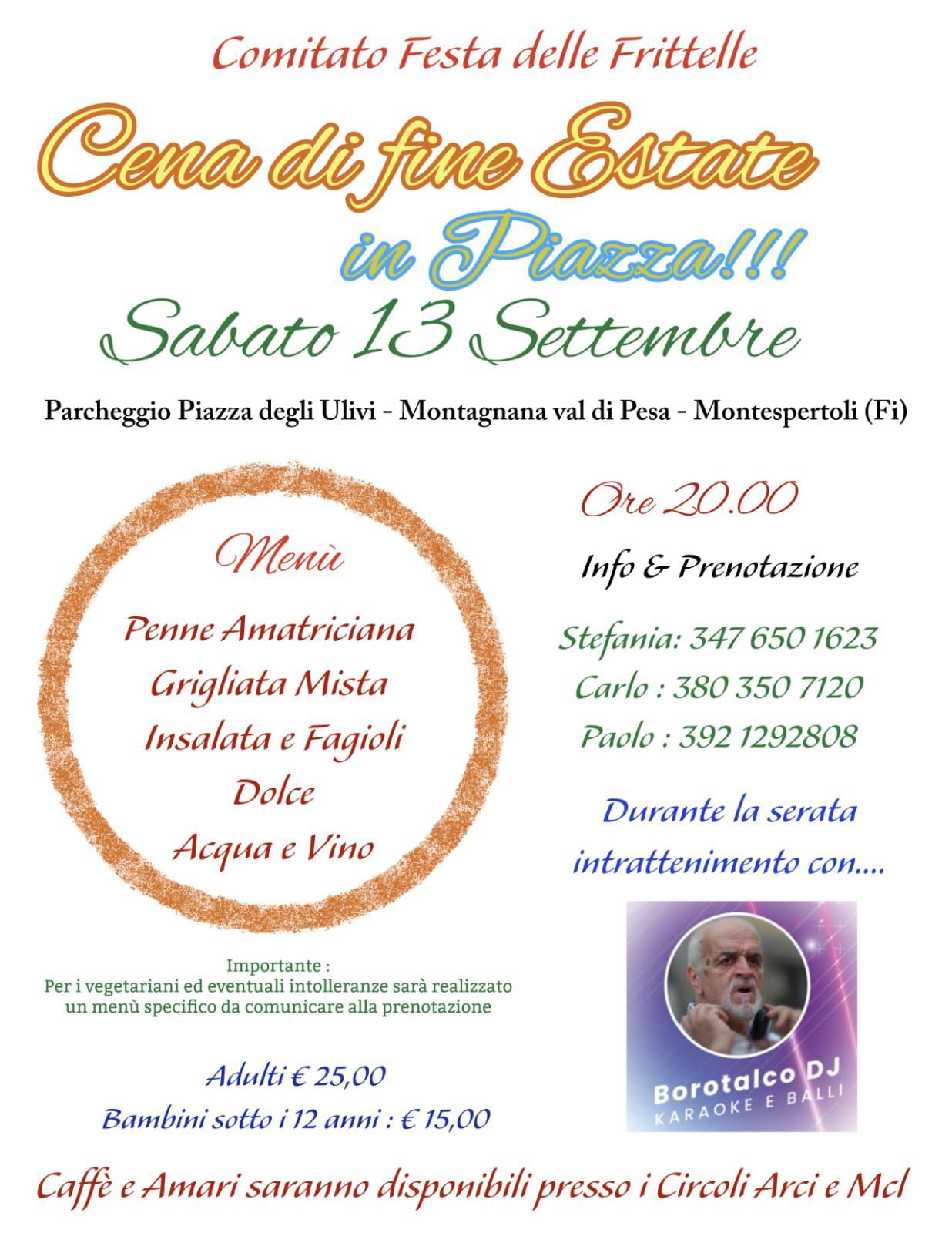 Sabato 13 Settembre 2025, il Comitato Festa delle Frittelle organizzerà una serata speciale per salutare l'estate con una Cena di Fine Estate, che si terrà a Montagnana Val di Pesa, presso piazza degli Ulivi, a partire dalle ore 20:00.