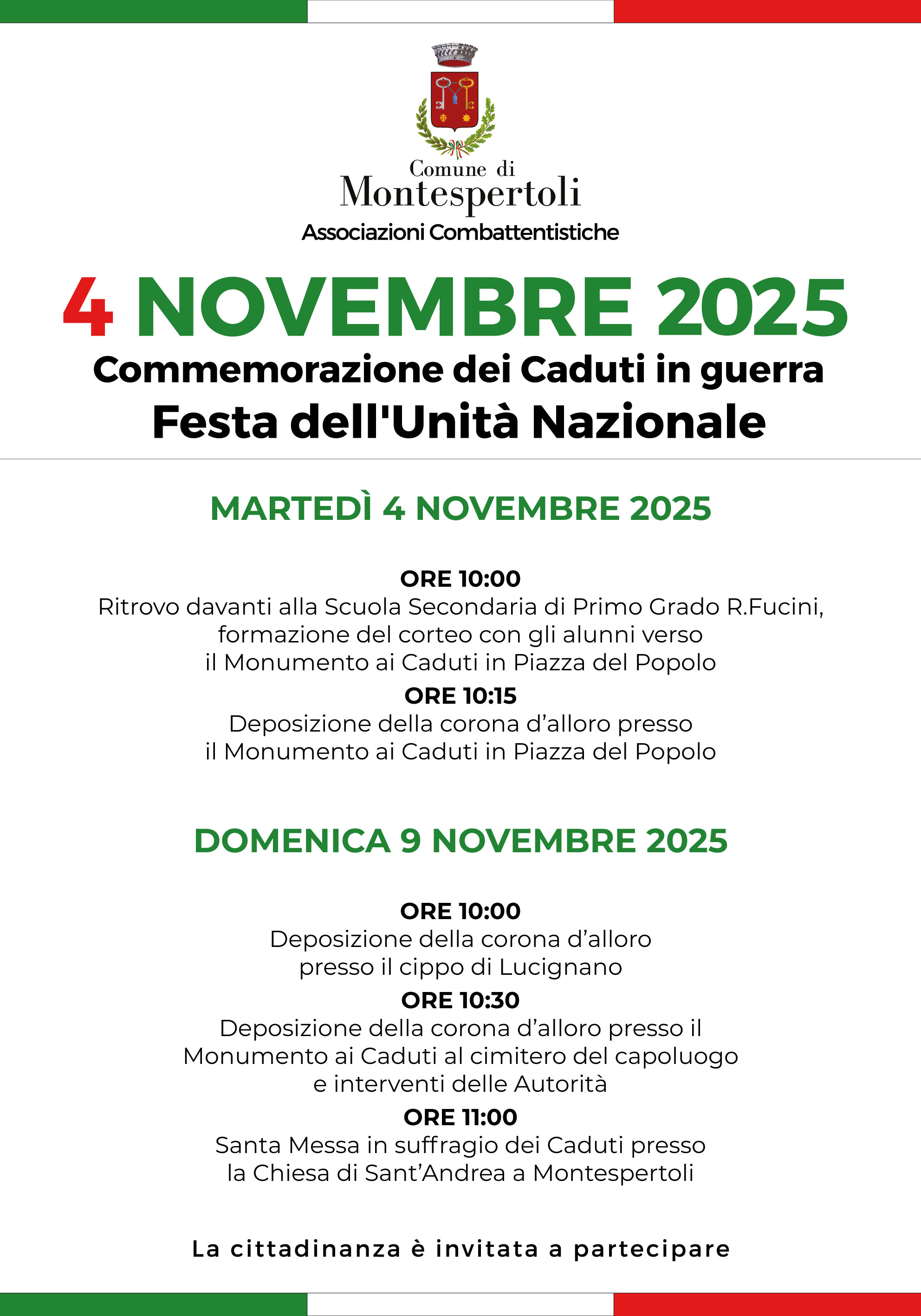 L’Amministrazione comunale invita la cittadinanza a partecipare a questi momenti di raccoglimento e riflessione, per rendere omaggio a chi ha sacrificato la propria vita per la Patria e per rinnovare insieme i valori di unità, democrazia e solidarietà che tengono viva la nostra comunità.