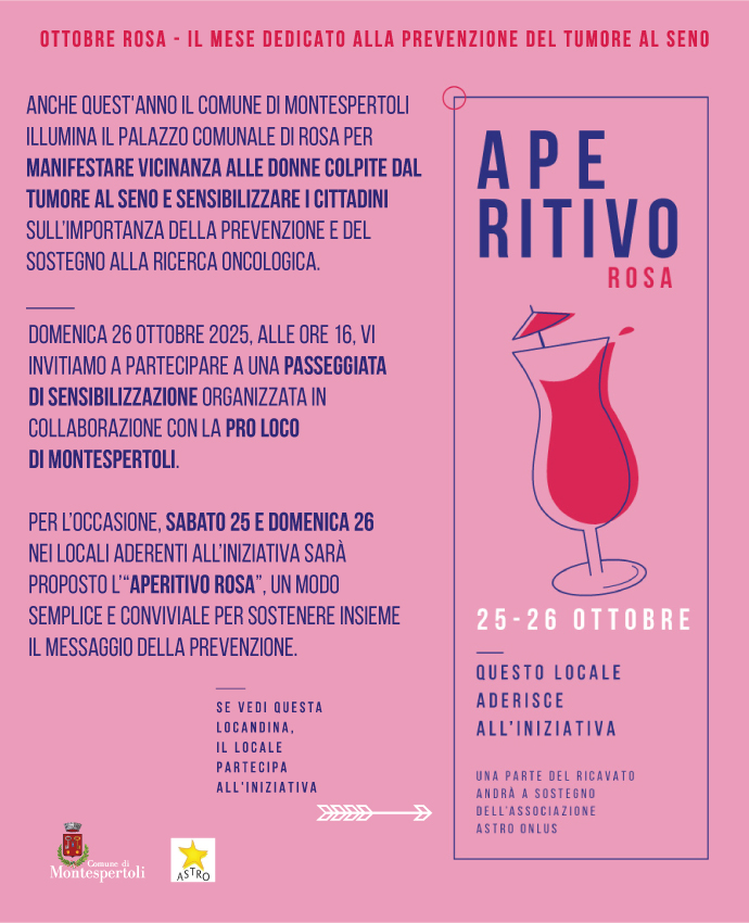 Anche per il 2025, il Comune di Montespertoli aderisce con convinzione alla campagna "Ottobre Rosa – Prevenire per sconfiggere", promossa in collaborazione con ASTRO Onlus e con la rete dei Comuni dell’Empolese Valdelsa e Valdarno Inferiore.