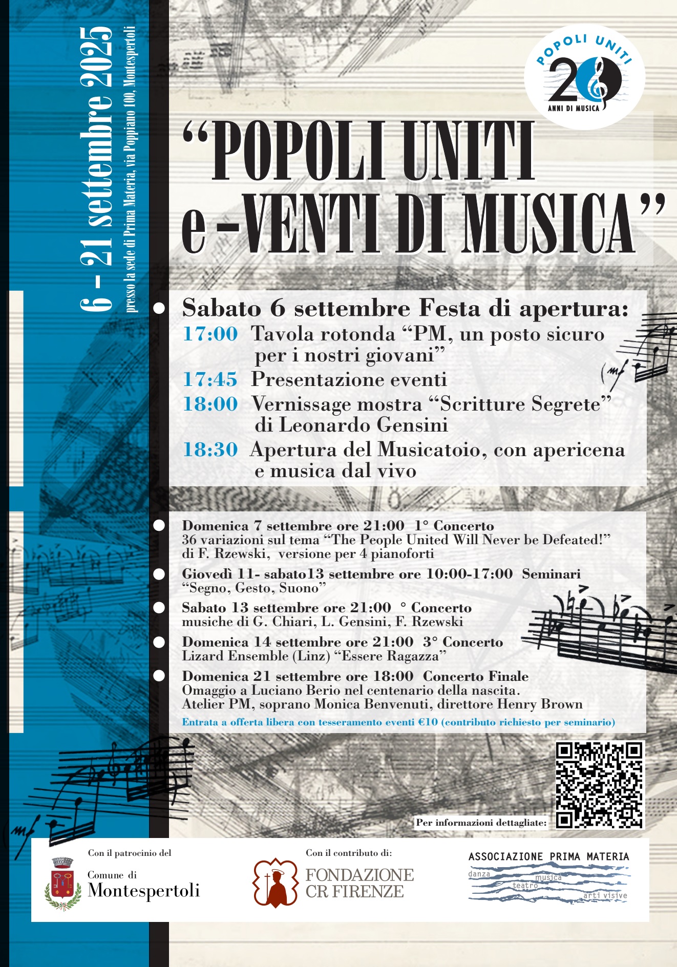 Dal 6 settembre prende il via la rassegna “Popoli Uniti e-Venti di Musica”, promossa dall’Associazione Prima Materia in occasione del ventennale del progetto Musicatoio.
