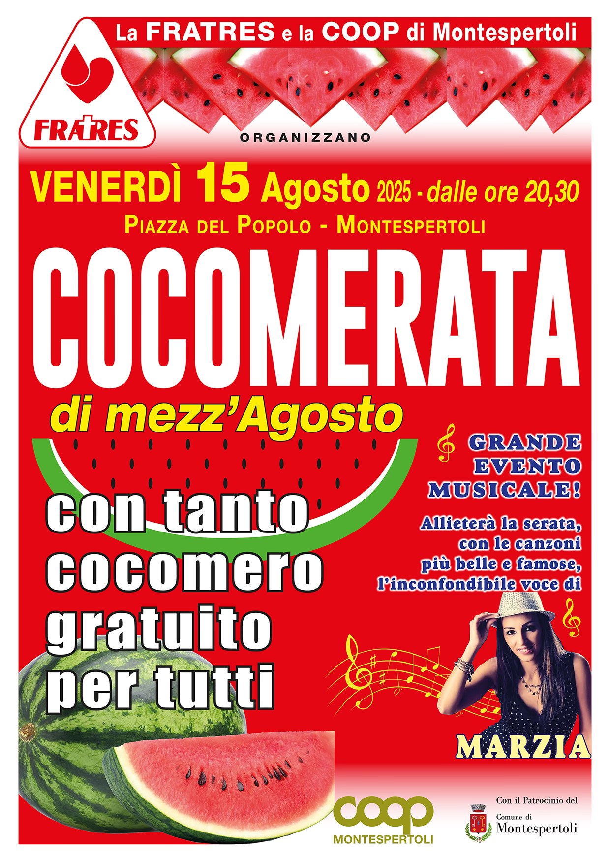 Il Comune di Montespertoli, con il patrocinio all’iniziativa, è lieto di annunciare la tradizionale Cocomerata di Mezz’Agosto, organizzata dalla Fratres e dalla Coop di Montespertoli.