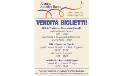 online su www.ciaotickets.com; di persona, da martedì a domenica, presso l’Ufficio Turistico di Montespertoli; nei locali dell’URP di Piazza del Popolo, dalle ore 20:00 alle 23:00 da domenica 27 luglio a sabato 2 agosto e domenica 3 agosto dalle ore 17:00 alle ore 21:00; presso l’Ex Edicola di Piazza del Popolo, nei giorni martedì 22 e martedì 29 luglio. Inoltre, martedì mattina (22 e 29 luglio), l’Ufficio Turistico sarà presente al mercato settimanale, sempre presso l’ex edicola dalle ore 10:00 alle ore 13;00.